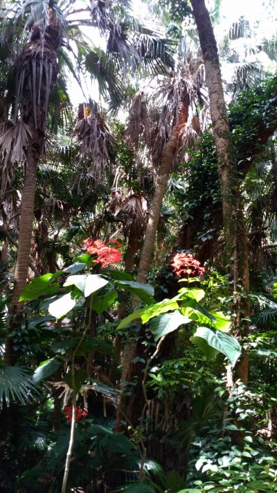 青島神社の参拝を済ませ右手へ進むと、想像していなかったジャングルのような景色が広がっていました。周囲1.5キロの小さく平たい島には、亜熱帯植物だという木や草花が群落となっています。背の高いヤシ科のビロウが林となって、その下は暑さを感じませんでした。