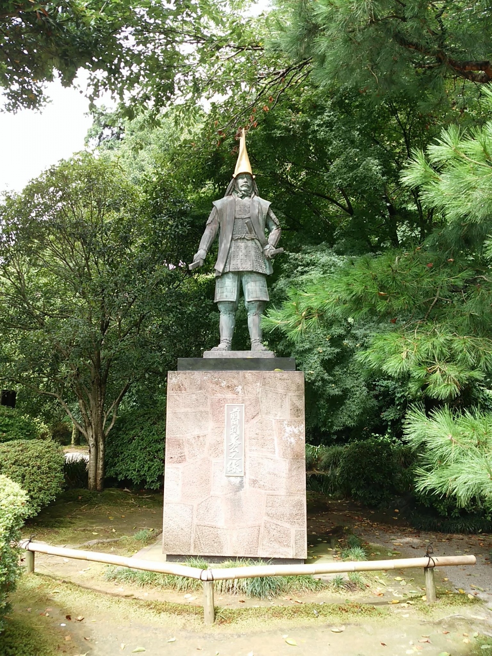 加賀百万石を築き上げた前田利家公の像は、兼六園に向かう坂の下、交差点の金沢城の側にあります。烏帽子形兜だけが金色で、とても印象的です。金沢は金箔が有名ということを思い出しました。遠くを見据えた凛々しい表情の立像です。