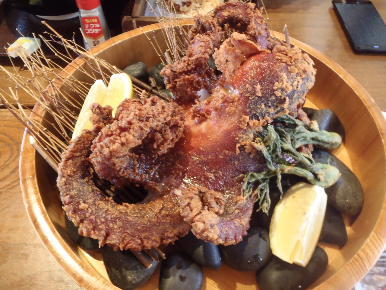 しまなみ海道サイクリング中、ランチで立ち寄りました。定食の他に、気になるメニューたこの一匹丸揚げをオーダーしてみたところ、大きなたこが桶に入って登場しました。添えられていたレモンを掛け、ハサミで切って食べます。美味しいのですが、一向になくならならず・・・定食にプラスでは多かったようで、多人数で食べると楽しいかなと思いました。