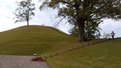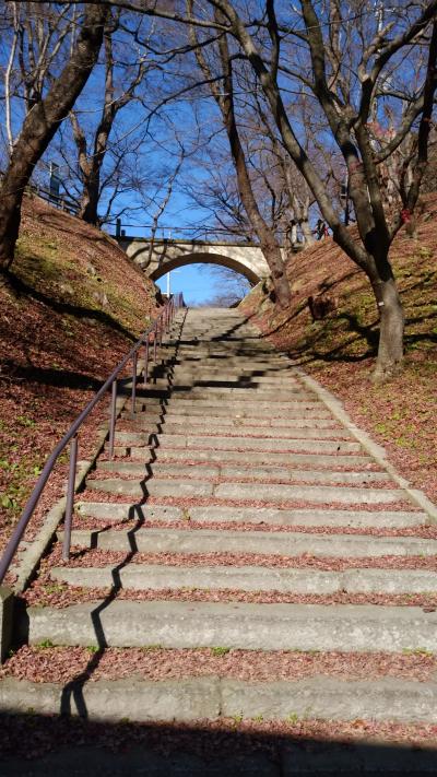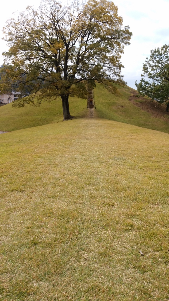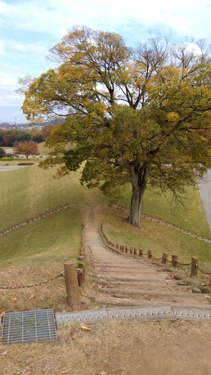 墳丘の全長169m、4世紀後半に造られた東日本最大級の前方後円墳です。前方部と後円部の高さが異なり、階段を2度上がって頂へ。訪れた時は大型の台風24号のひと月程後で、竪穴式石室の印の位置に、頂のクヌギの木が倒れてしまっていました。隙間から見えた説明書きには、鏡や鉄斧が発見されたものの、棺や遺体は残っていないとありました。