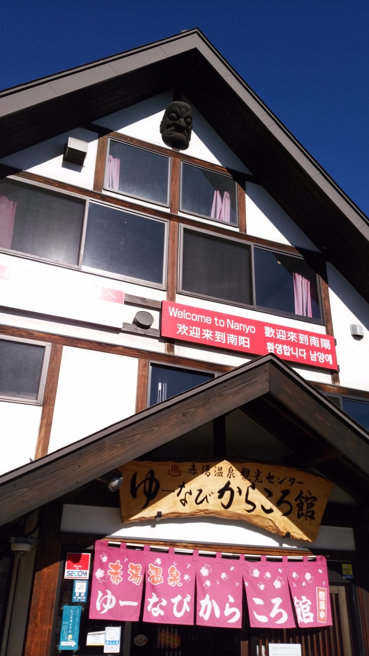赤湯温泉大通りのほぼ中央です。建物横の天然温泉の足湯は、気持ち良い温度でした。
