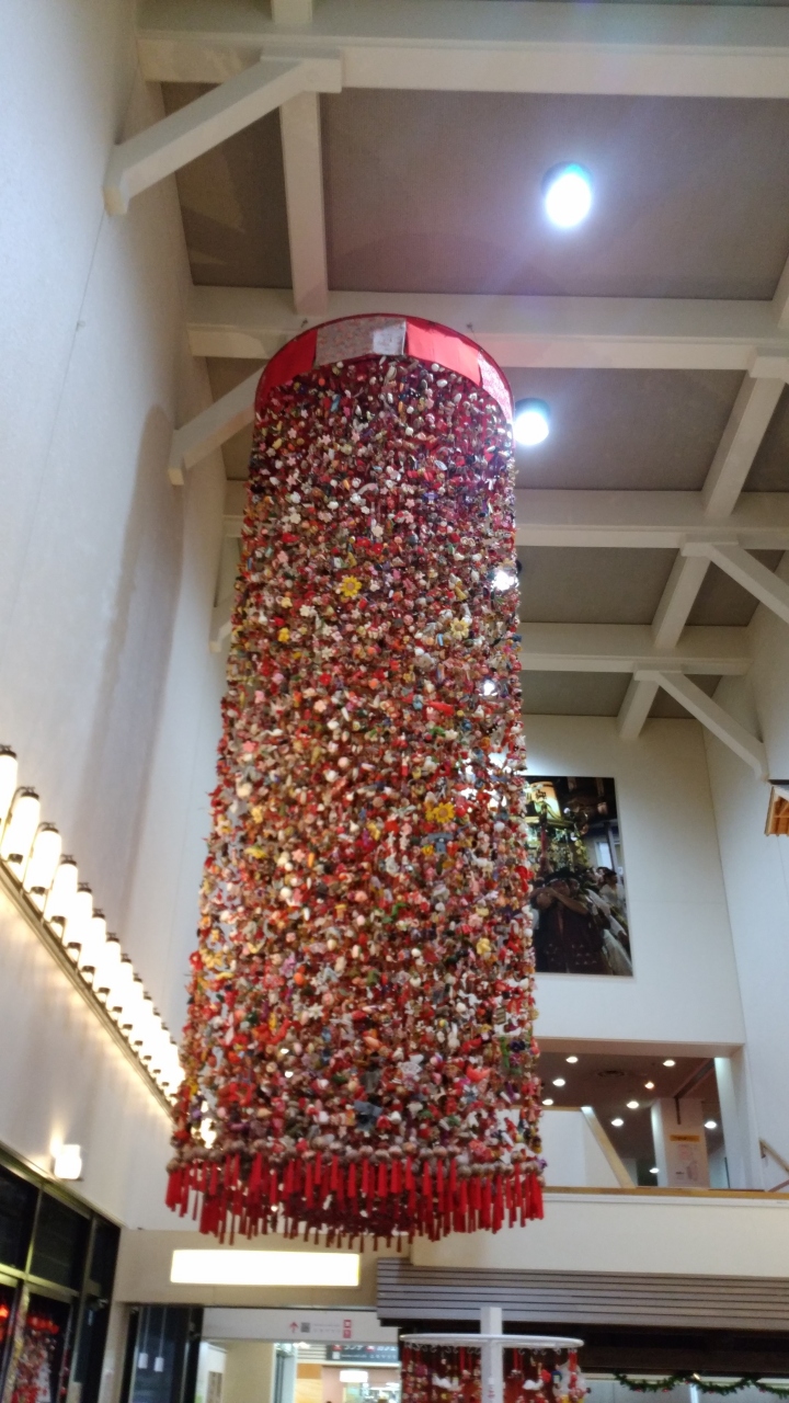キナーレの隣りの建物です。外観は一見すると、市役所か公会堂のようにと思いました。会議室などもあるそうです。お土産品が充実していて、お米や地酒の種類も豊富です。きものの町であることからか、道の駅では珍しく、和装着物や生地も扱っていました。華やかに飾られたつるし雛はギネス認定で、これまで見たものの中でも圧倒的な大きさでした。