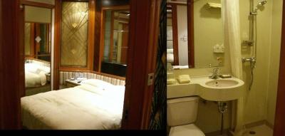 一番安いお部屋がこれで5700円位でした。内側の部屋で窓はありません。画像で見ての通り、お部屋の全てがベッドで埋まっています。扉を開けると廊下から部屋の中は丸見えです。ただ、内装は綺麗にしているし、アンティーク風な電話や机などこだわりが感じられ、雰囲気は悪くありません。水回りは、ユニットで浴槽はナシ。シャワーの出はよいです。必要なアメニティも揃っています。が、やはり、カミソリと冷蔵庫、もちろん寝間着もありません。でも、ちゃんとドライヤーもあるし、無料のお水もあるし、6000円以内なら全然納得です。それに外灘までは5分もかからないし、地下鉄2号線の「南京東路」までも5分強で行けます。