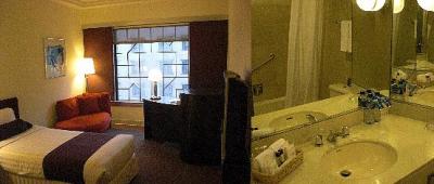 お安い方のホテルです。ガーデンビューで1泊2万でした。最初MTRの駅から歩いたのですが、ものすご~く遠いです。実は、MTRを降りるとディズニーランド方向とは反対に歩くとバスターミナルがあって、そこから2つのホテルを循環する無料のシャトルバスが出ています。それに乗らないと、きびし~かも。閉園後も運行されていますので、街中から戻ってきても乗れます。ホテルはやはり新しいということもあって綺麗です。部屋は決して広いとは言えませんが充分です(ただエキストラベッドが部屋の中に立てかけてあるのはどうかと…)。至る所に、ねずみ、ねずみ、してます。シャワーカーテンもミッキーには驚きでした。周囲には何もありません。コンビニでの買い物は街中でしておき、必要なものは持参しましょう。バスローブ・アイロン完備、アメニティも充分に揃っています。