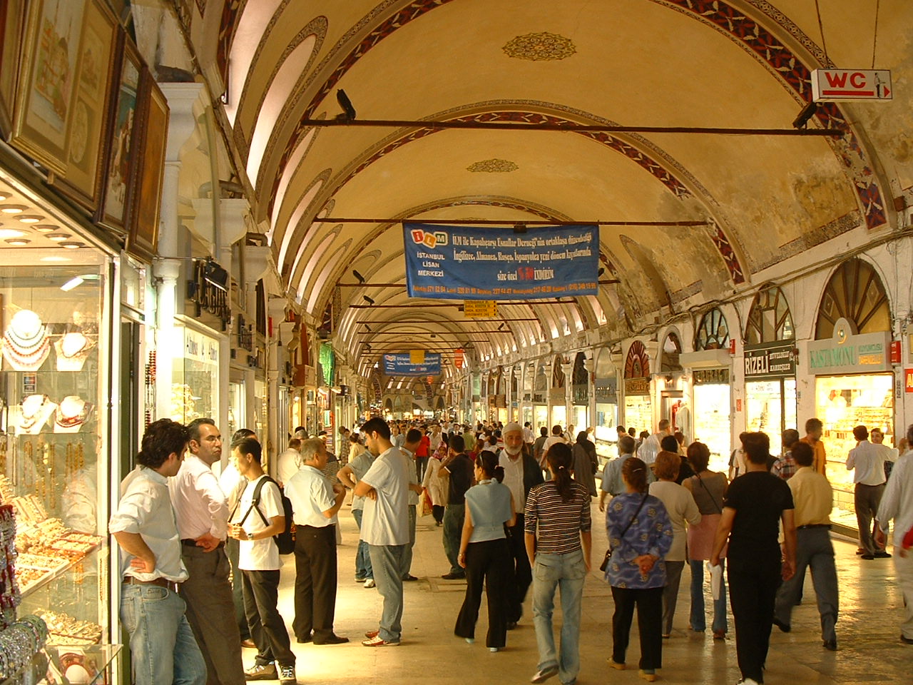 グランドバザールでは、観光客が買い物をすると必ず カモにされて随分高く売りつけられると聞きます。ツアーで時間が無ければ仕方ありませんが、時間が自由になる個人旅行なら存分に値段交渉が楽しめます。バザールに行く前に値札の付いている店を参考にして大体の価格を把握しておき、いざバザールに乗り込みます。この店主の言い値は安いか高か判断しながらショッピングに臨みます。買おうかな?止めようかな?という駆け引きが面白く、ワクワクします。バザール内は似通った商品を扱う店が連なっているので、比べてまわると結構楽しい。値札商売の店よりも、数を増やして買うと意外に安くなるので、ビックリするほど損はしません。ここでしか無いというような物もあったりするので、欲しいなぁ、いいなあと思ったら、買っておいた方がいいかなと思います。バザール内は広くメインの通り以外は細かい迷路のようになっているので、見印をハッキリと決めておいて歩きだしましょう。私は方位磁針があったので何とか出られました。まあ、歩いてイスタンブール旧市街から出てしまうようなことはないのでご安心ください。最近は韓国の旅行者が多いらしく、よくコリアかと尋ねられました。敵もさるもの、日本人と分かれば日本語で大攻勢をかけてきますが、そんなに強引ではありませんでした。不況の日本人の財布の中身を知ってか知らずか? でも、伝統あるグランドバザールは、イスタンブール観光には絶対に外せません。