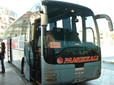 トルコ公共交通の代表格は、バスです。大きな町の郊外にはオトガルというバスターミナルがあり、トルコ各地を目指して頻繁に出発していきます。バスはとても綺麗な高級車(ベンツ)で、ゆったりと乗れます。空調もいいし、サービスも素晴らしい。運転手以外に服務員が乗車していて、おしぼりや湯茶(コーヒー・チャイ・ミネラルウォーター)、のサービス、軽い(スナックやケーキ)の配布があります。乗車時にはコロンヤとかいうレモンの香りの消毒液のような物を手に掛けてくれます。これは好き嫌いがありますが、私は嫌いではありません。今回は、パムッカレバスという会社を利用しましたが高速道路を時速90キロの安全運転で走行し、何も問題はありませんでした。1時間に1回位のトイレ休憩はあるし、昼時には、サービスエリアに停車し、昼食を食べたり等の休憩時間が取れます。トルコ旅行は、このバスを使って快適に楽しめます。