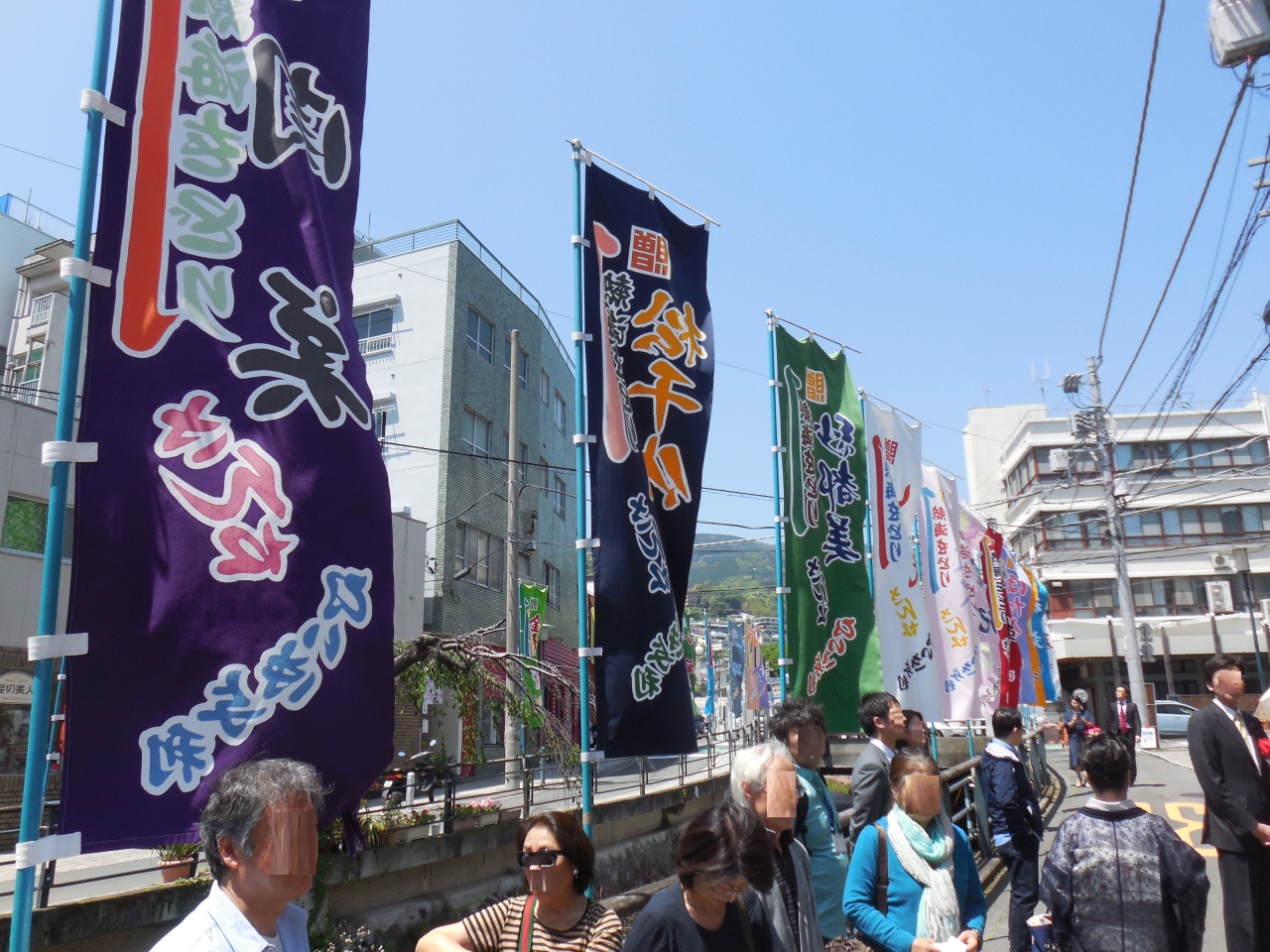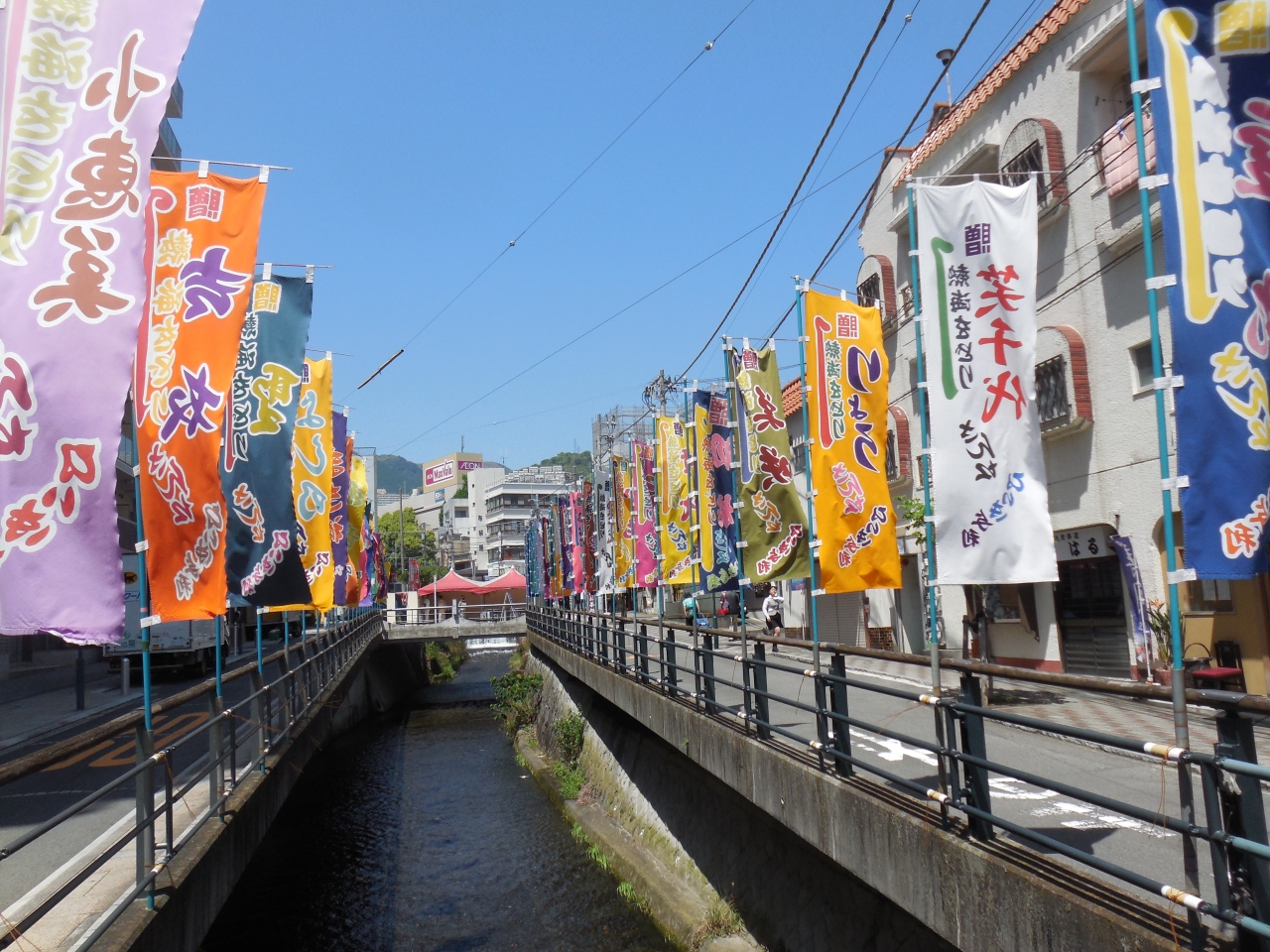 現在は、建物の漏水(雨漏れ)補修工事のため建物廻りに工事用仮設足場が組まれていましたが、『熱海芸妓見番歌舞練場』の前を流れる初川の両岸には、現在活躍されている120名余りの「芸妓」の名前が入った「熱海をどり」の幟が立ち並びとてもとても華やかでした。