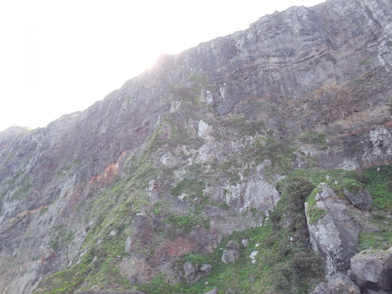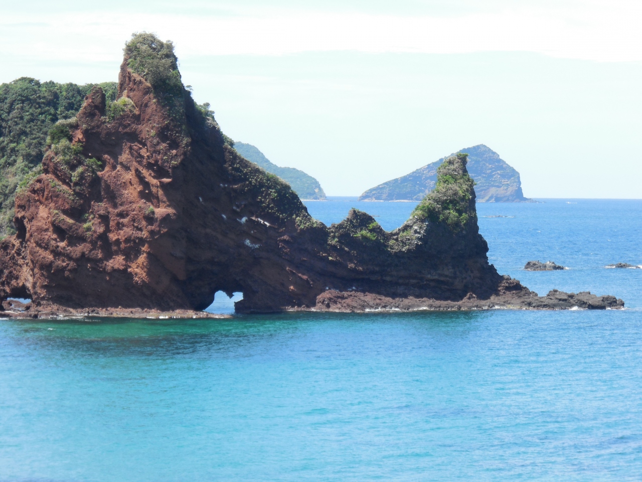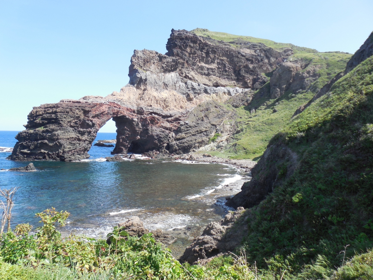 「摩天崖」の先には、アーチ状の岩の架け橋「通天橋(つうてんきょう)」と名前が付けられた『国賀海岸』の代表的なビュースポットを観光船から眺めながら、「国賀神社」(小さな祠)のある国賀浜に立ち寄り休憩を兼ねて観光船から一度降りて、「摩天崖」まで通じている全長約2.3キロメートル、高低差約250メートルに及ぶ「摩天崖遊歩道」(草原地帯)の国賀浜周辺だけでしたが、散策しながら「通天橋」や天上界・観音岩と名前が付けられた奇岩のビュースポットを地上からも眺めて楽しめました。