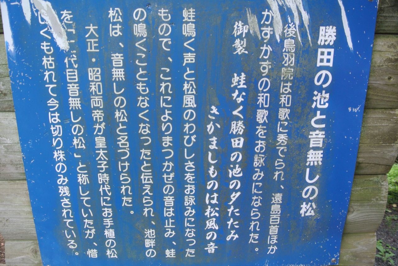 後鳥羽上皇行在所跡の脇には、後鳥羽上皇の詠まれた歌「かわず蛙鳴く勝田の池の夕たたみきかましものは松風の音」勝田の池の蛙が鳴いて松のきしむ音が上皇の心を悩ますので、この歌を詠まれたところ勝田の池の蛙も鳴かなくなり、また松のきしむ音もなくなったと伝わる勝田池があります。