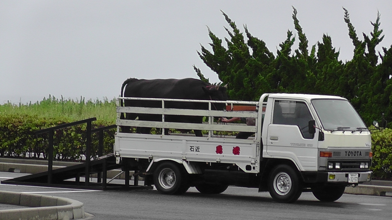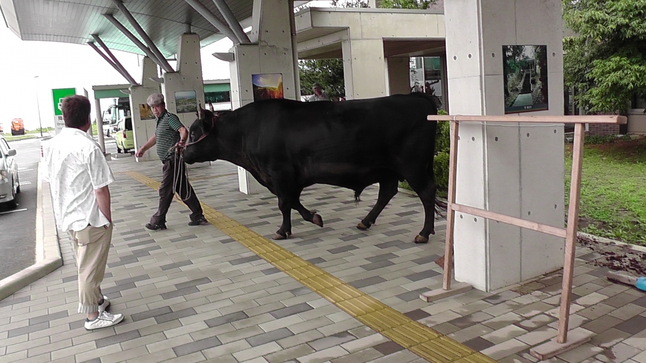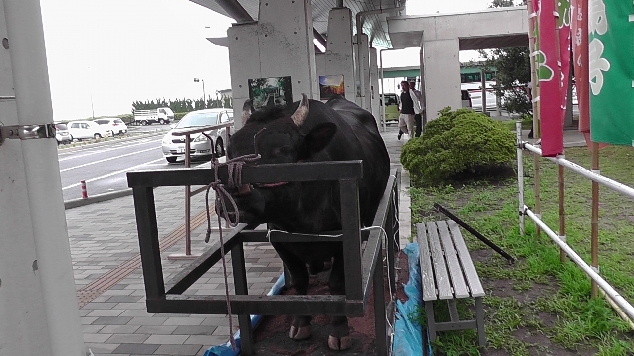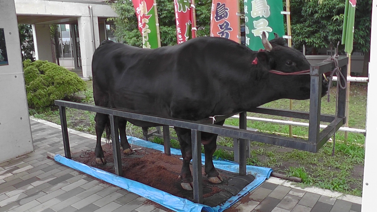 飛行機の到着に合わせて空港ターミナルビル玄関前に隠岐伝統文化である『牛突き』の横綱牛がお出迎えしてくれます。