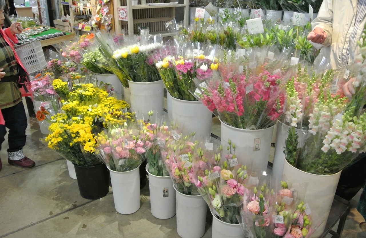 到着が日曜日の午前10時30分ごろだったので高速道路側・駐車場はすいていましたが、「豊作市場」は朝入荷の野菜を買い求めるお客で大変賑わっていました。地元の新鮮な野菜が豊富に揃っているのでお薦めのコーナーです。
