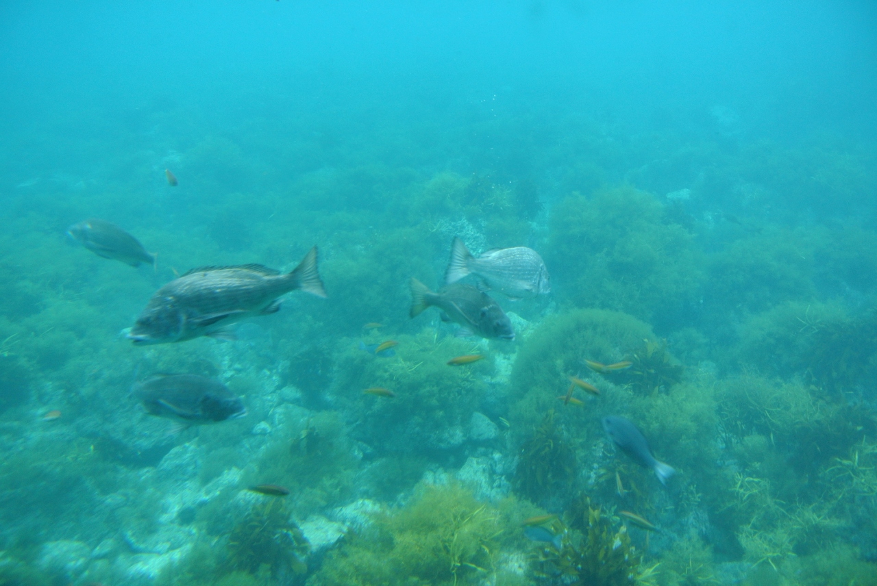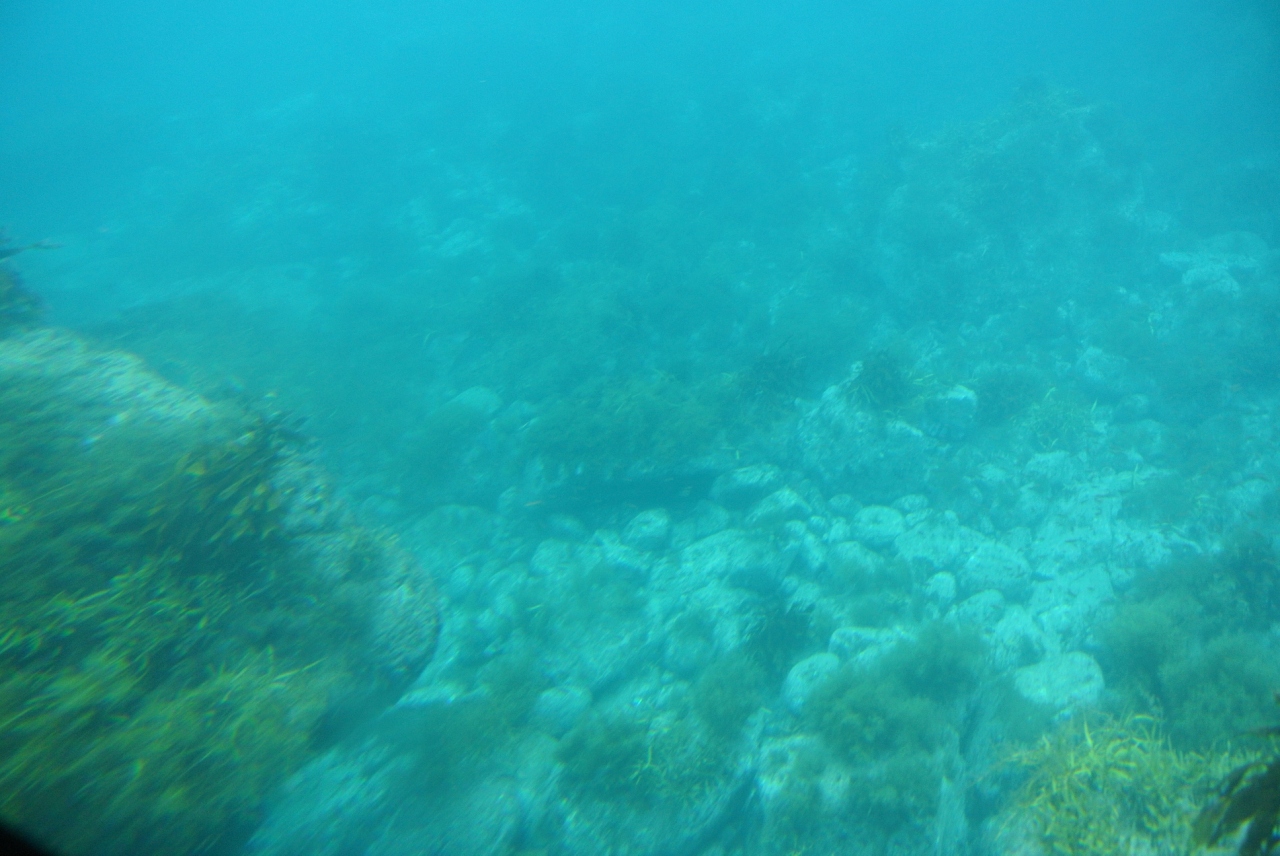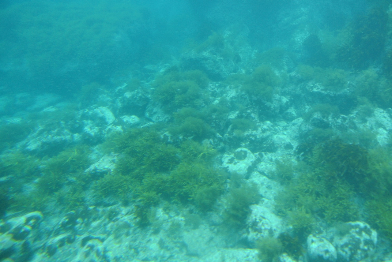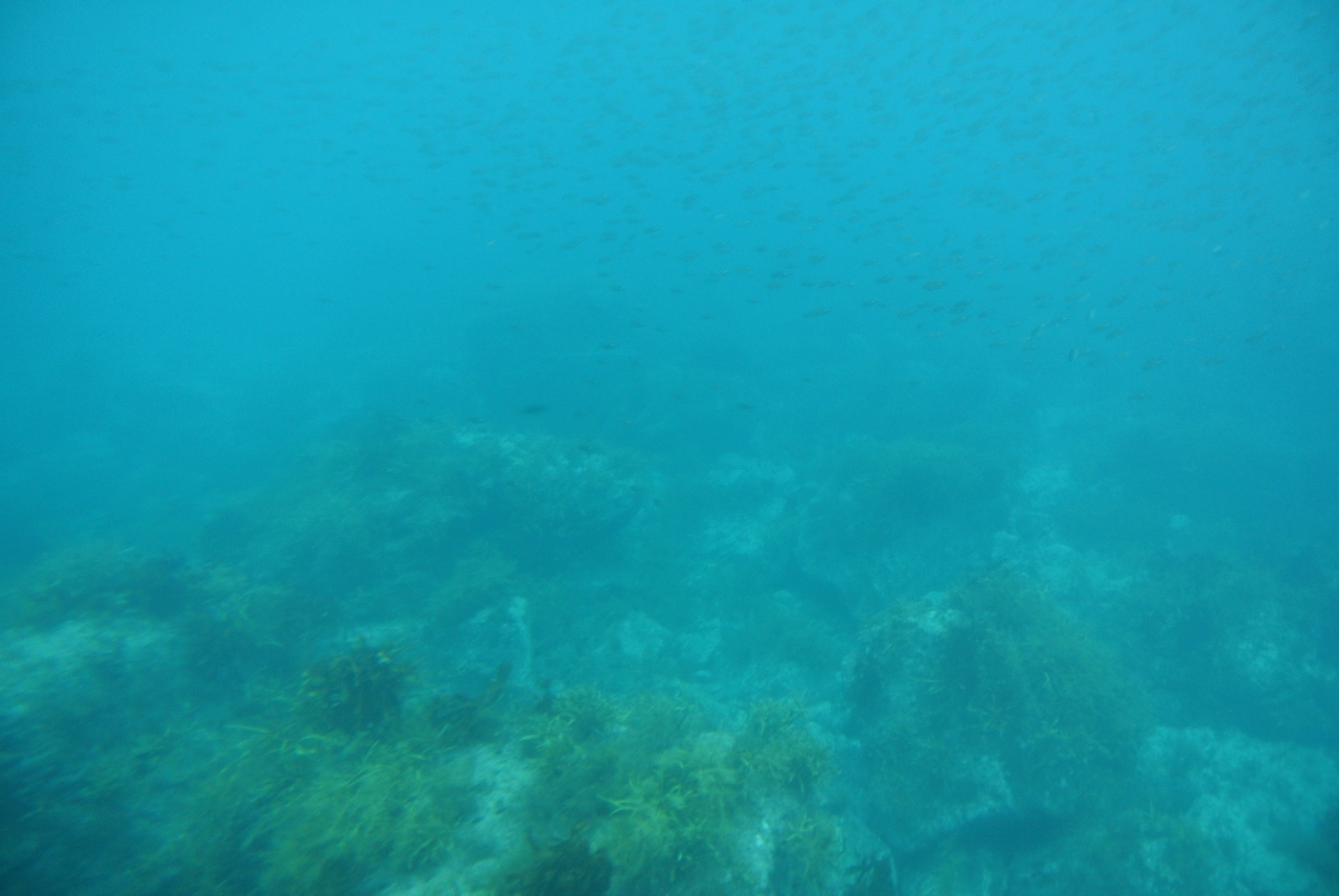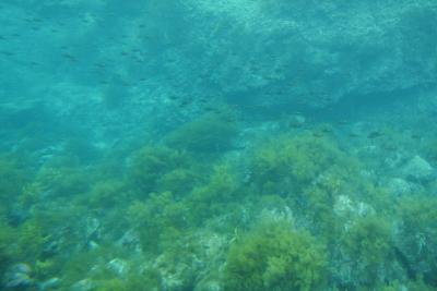 「三郎岩」周辺に到着すると船の下部分にある海中展望席に移動して海中を泳ぐ魚の群れを観察します。