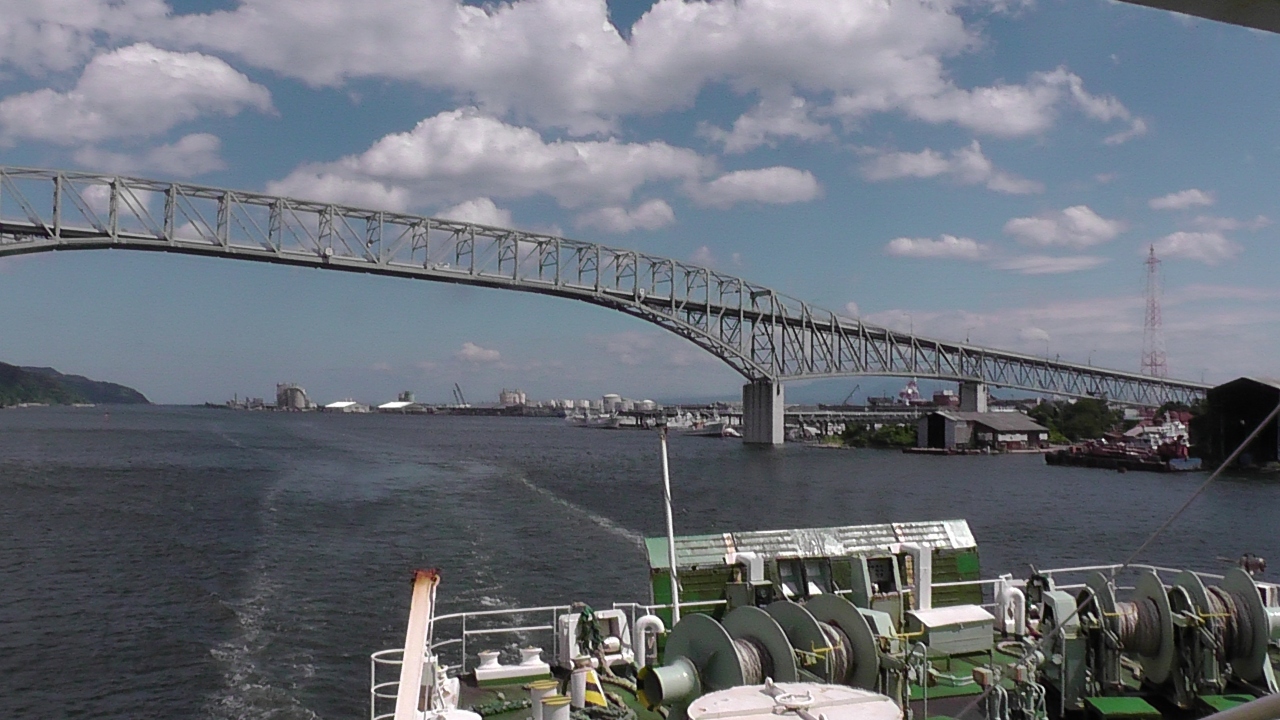 日本海を航行中は海上のうねりもありフェリーが揺れていましたが(前日はうねりが強く全便欠航でした)、本土「美保湾」に差し掛かるとフェリーの揺れも治まり、「境水道大橋」(長さ709メートル、高さ40メートルのアーチ橋)をくぐると目的地の「境港」です。(菱浦港から境港までの所要時間は約3時間30分でした。)