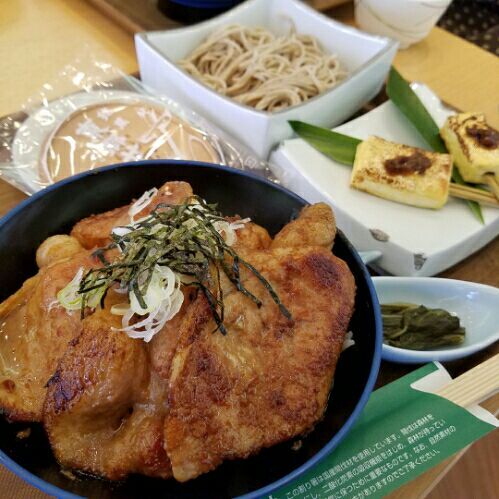 『ご当地ごちそうランチ』(「豚の味噌漬け丼」・「秩父そば」・「豆腐田楽」・「秩父しゃくし菜漬け」・吾野名物「東郷煎餅」)をいただきました。