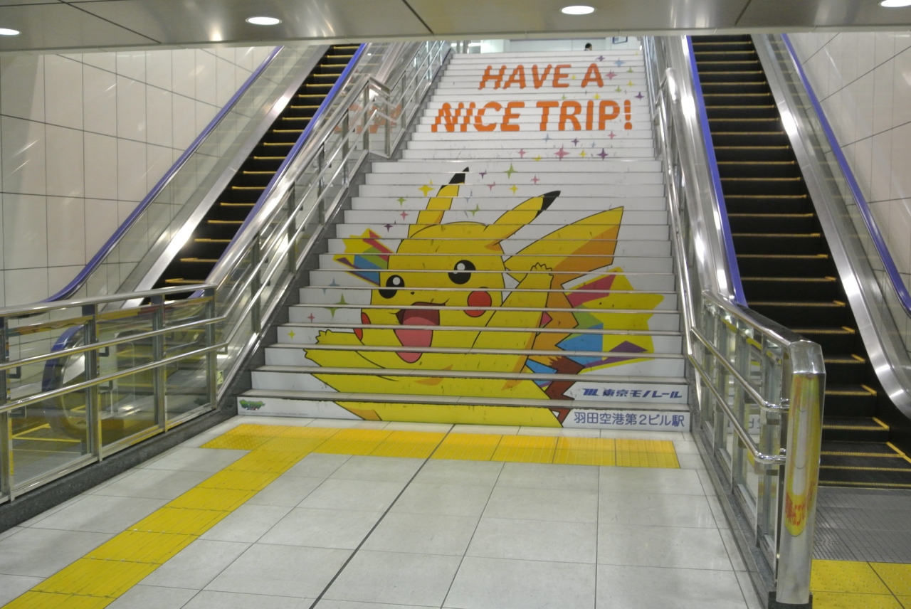 羽田空港第2ビル駅構内には、ちょうど人がほとんどおりませんでしたのでホーム階段に描かれているピカチュウを撮影してから帰りました・・・- 旅行時期