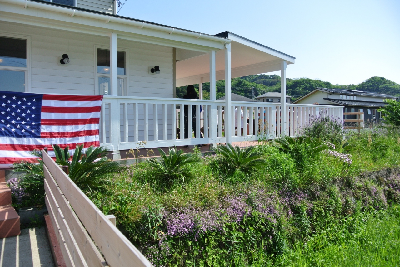 建物は白く塗られた板張りのアメリカンな木造平屋建てで建物内のテーブル席と建物外のテラス席があります。