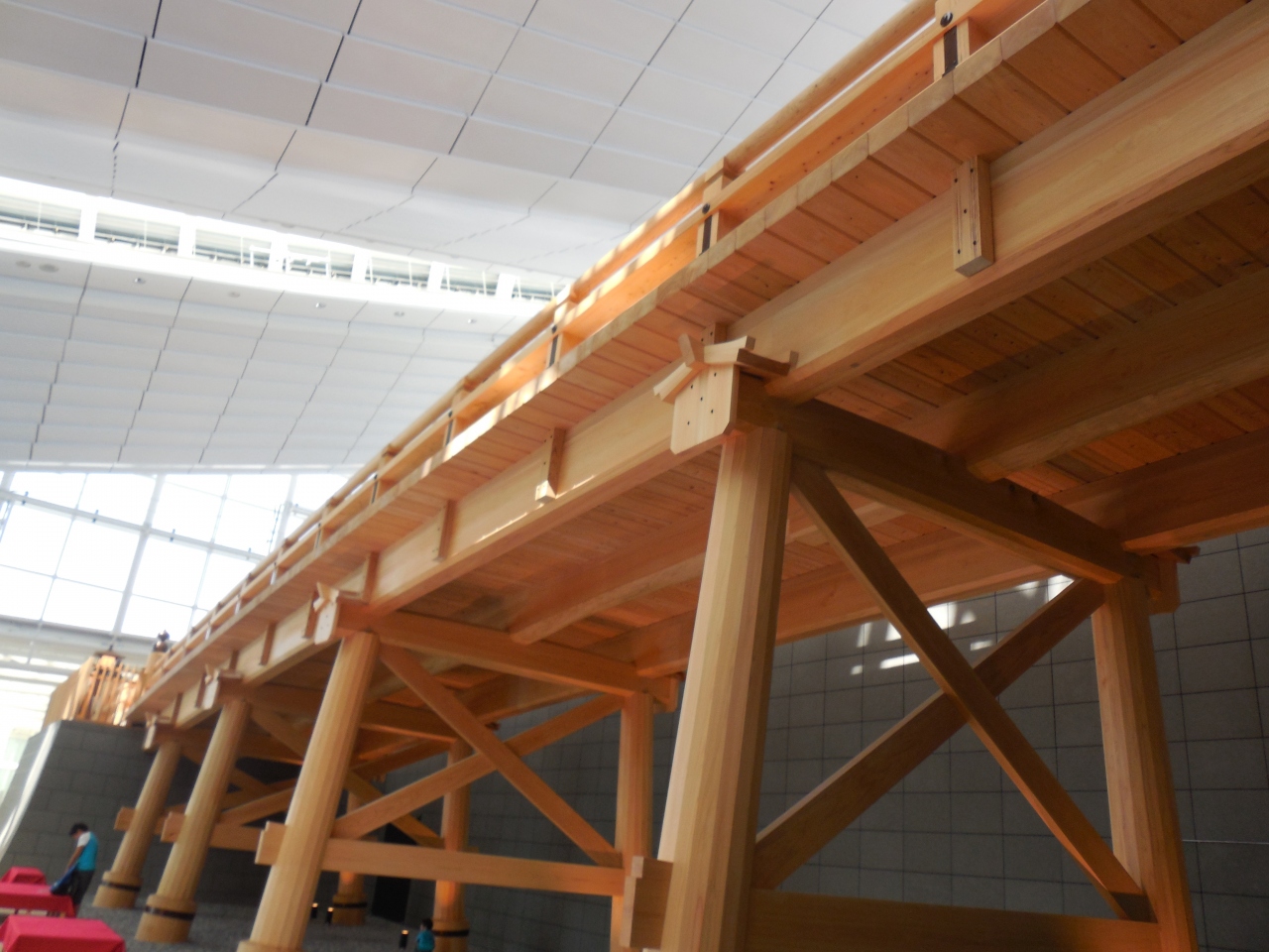 ターミナル4階から5階部分に架かる全長25メートルの橋は、檜造りの実物の1/2サイズとのことですが、まじかで見ると大きく感じ立派な造りです。