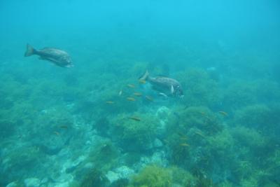三郎岩の周辺で船の下部分の海中展望席で海中を泳ぐ魚の群れを観察します。