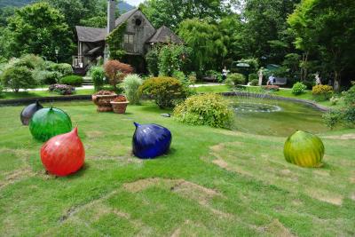 「表門(長屋門)」から園内に入ると敷地中央に大きな池があり、北東側に池の水際に浮いているように見える「六角浮き見堂」、北西側に高さ4メートル程度の築山の谷間から池に流れ込む滑滝や水辺の飛び石、西側に高台から庭園を望める「滝見台」、南側石垣の上に京都の北山杉を用いた木造瓦葺き平屋建ての数寄屋建築の「赤鳥庵」が配置されいます。