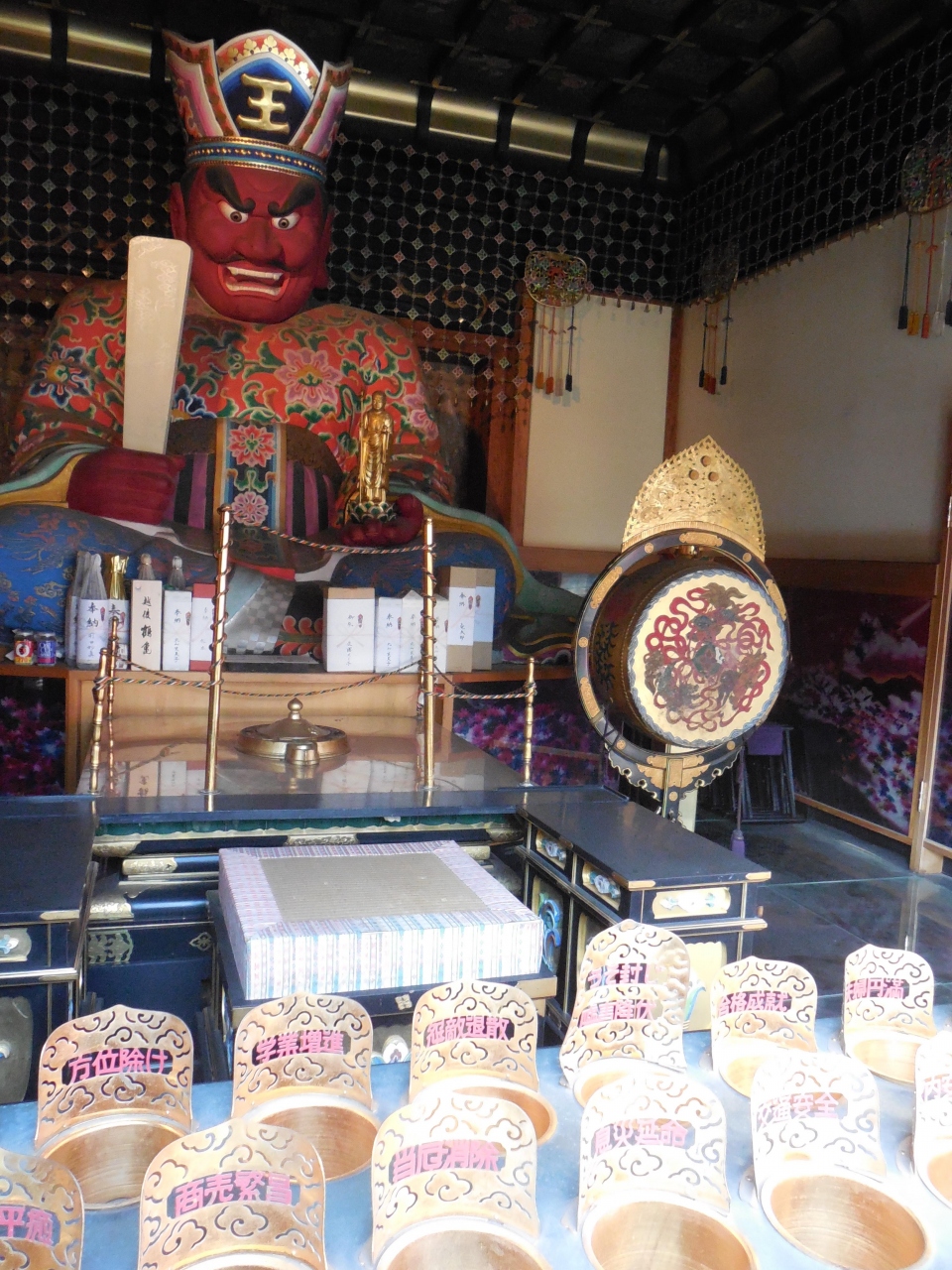 日本最大の閻魔大王座像(全高3.5m、全幅4.5m、重量1.5t、寄木造り)を参拝する際に19の祈願が書かれたお賽銭投入口にお賽銭を入れると閻魔様の説法を聞く事ができるハイテク閻魔様です。(祈願する内容により説法の内容が異なります。)
