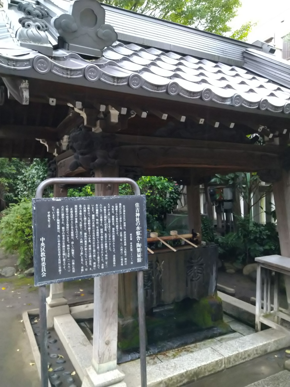『住吉神社』境内もコンパクトですが、拝殿・幣殿・本殿が一体となった権現造りの社殿は拝殿・幣殿部分が1870年(明治3年)に再建された建築物であり、参道の脇にある石造の水盤は江戸時代中期の1841年(天保12年)に奉納されたもので水盤舎は1869年(明治2年)に再建されたのち1911年(明治44年)に改築されており1990年(平成2年)に「中央区民有形文化財(建築)」に登録されています。