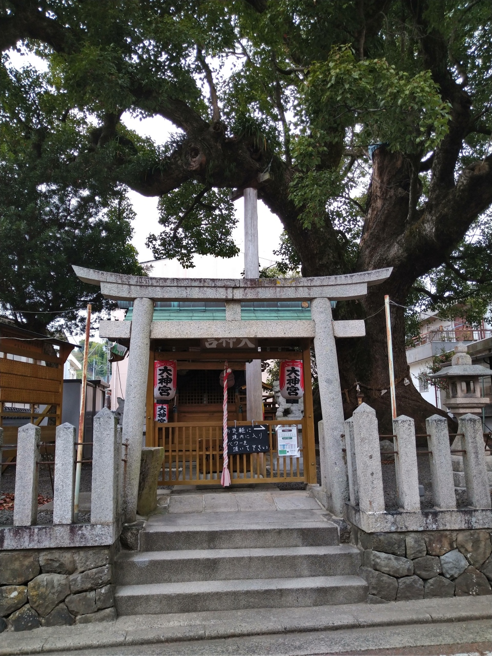 コンパクトな境内の『大神社』には、パワースポットとして存在感のある樹齢1000年余りと推定される御神木の「クスノキ」(高さ約25メートル・幹廻り約15メートル)があり圧倒されました。