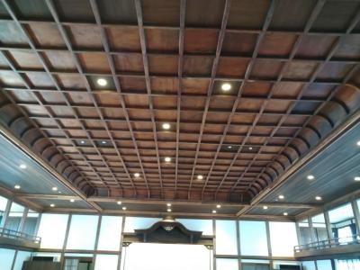 施設のメインとなる議場エリアについては、間口:18メートル、奥行:23メートル、高さ:6メートルの吹き抜け部分に柱を設けない折り上げ格天井の大空間に仕上げられており圧倒されました。