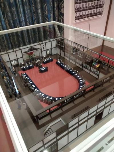 館内は、建物正面部分から本館エリア・議場エリア・控え室エリアで構成されており、本館が県会議員のためのエリアとして1階に受付・傍聴人控所・接見室、2階に議長室・書記室・議員休憩室・議員応接室が備えられており、現在は2階が資料・模型などの展示スペースとなり歴史とともに建物復元時の建物各所の貴重な部材などを見ることができ楽しむことができました。