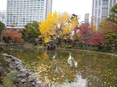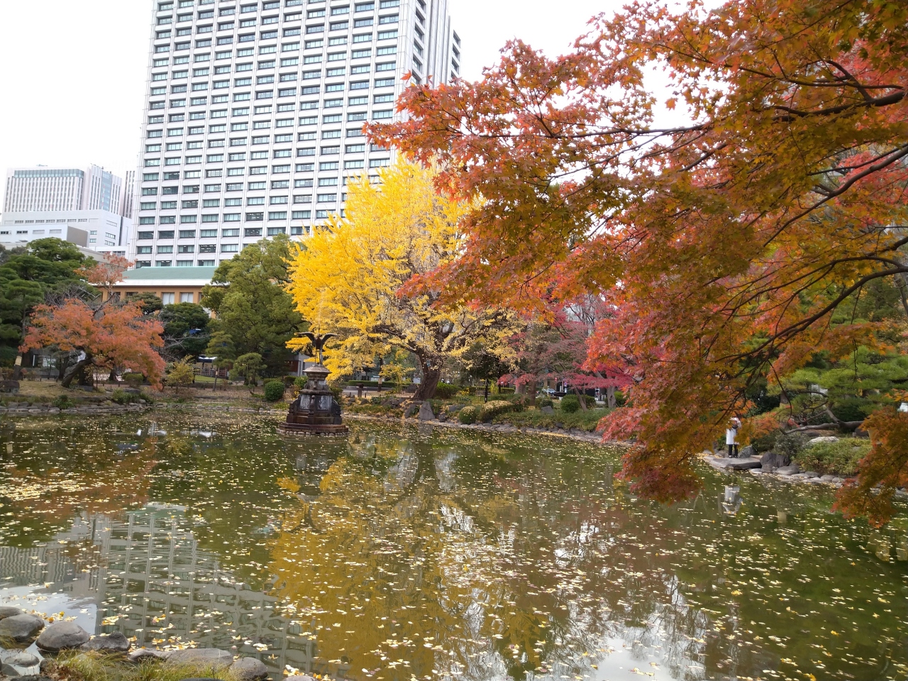 『日比谷公園』に立ち寄った際は、天候も良く『雲形池』周囲のモミジとイチョウの紅葉した赤色と黄色に空の青色の調和のとれたコンストラストが水面にも映りとても奇麗で癒されました。