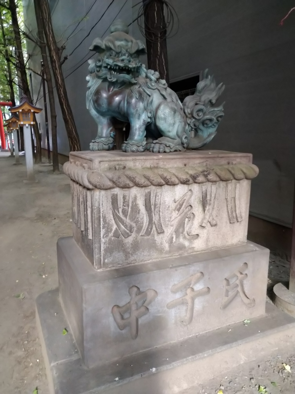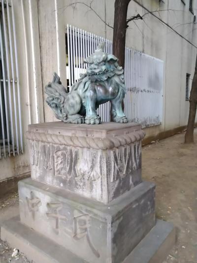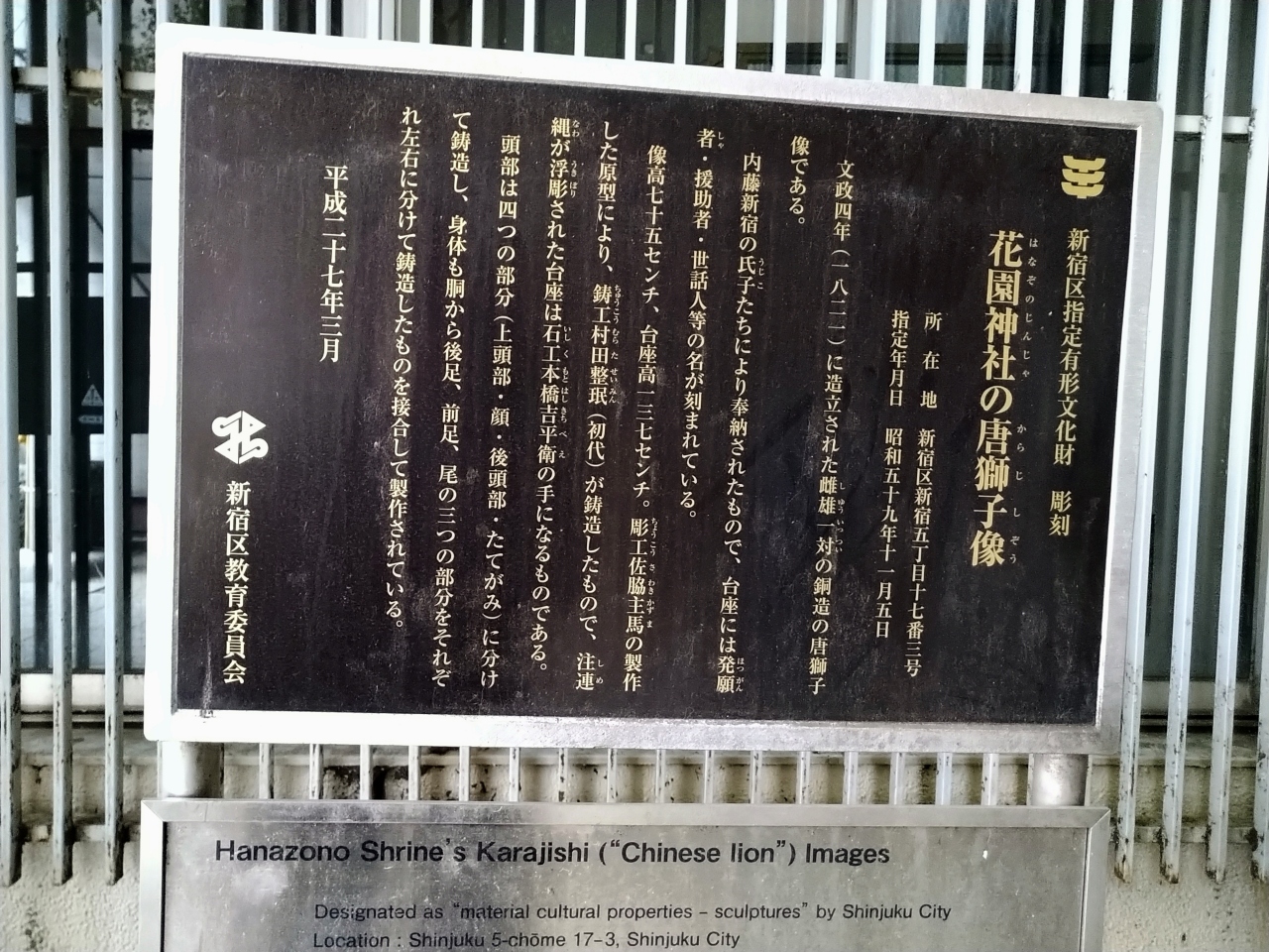 「靖国通り(都道430号)」に面するビルとビルに挟まれた幅が4~5メートル程度の南参道から石造りの鳥居をくぐってすぐの場所に配置されている雌雄一対の銅製「唐獅子像」は、1984年(昭和59年)に「新宿区指定有形文化財 彫刻」に登録されています。