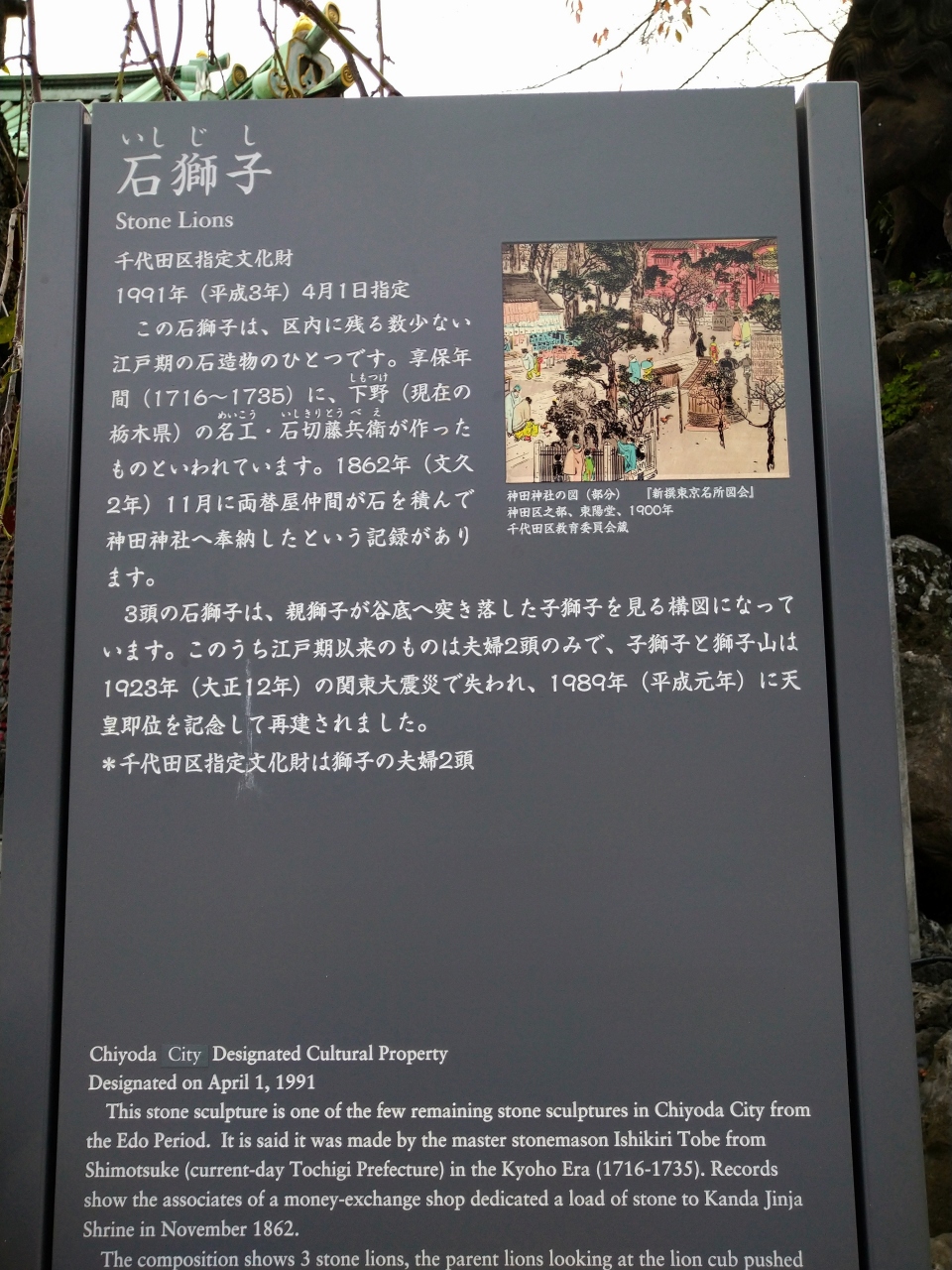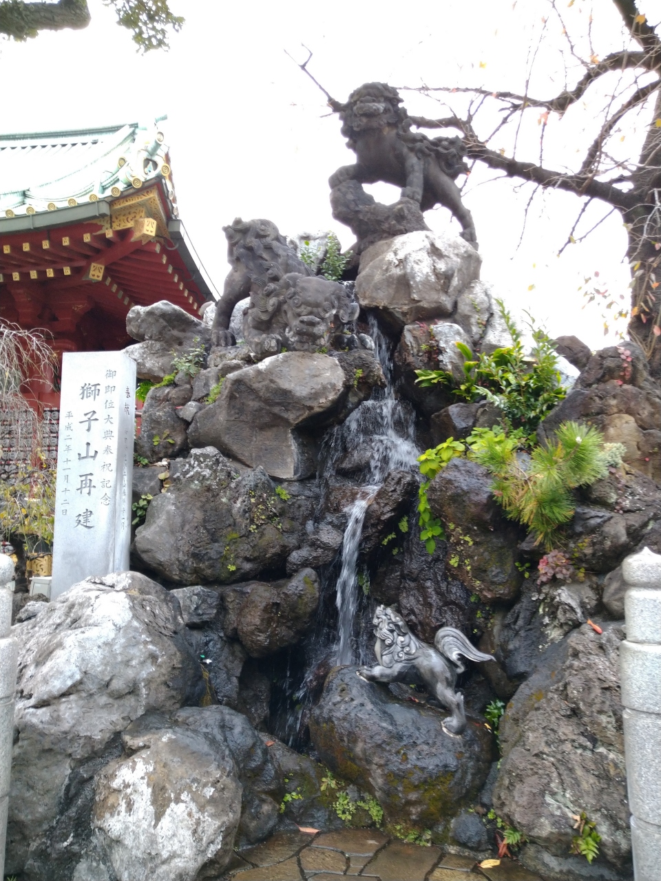 この「唐獅子像」(像高75センチメートル)は、江戸時代末期の徳川幕府・第11代将軍「徳川家斉」の時代である1821年(文政4年)に氏子たちによって寄進されたもので、江戸末期の鋳工として活躍した初代「村田整(むらたせいみん)」の代表作であり、彫工「佐脇主馬(さわきかずま)」が制作した木彫り原型から頭部を四つの部分(上頭部・顔・後頭部・たてがみ)に分割、身体も胴から後足、前足、尾の三つの部分をそれぞれ左右に分割して鋳造したものを鋳掛け溶接技法で接合したとされる小さな像ですが精巧な造りに目を奪われました。