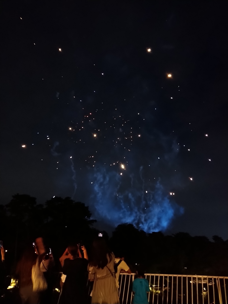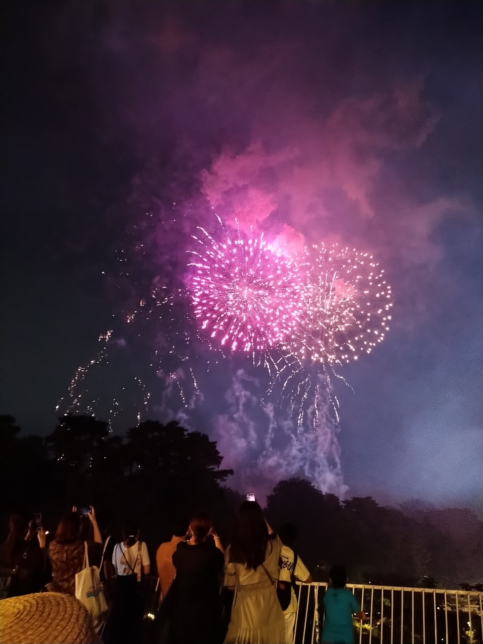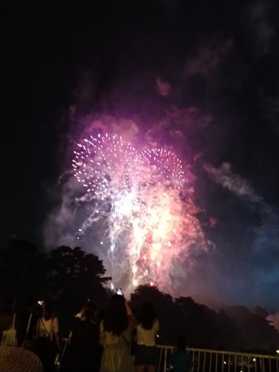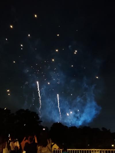 「夕日丘一丁目広場」のベンチから特設ステージを見ることができませんでしたが、大音量の音楽にあわせて間近で打ち上る花火は短時間ですが花火の火薬を包む紙の破片が降ってくるなど迫力がありお薦めできます。(特設ステージでは、水の放水があったり、炎を吹き出していたようです。)