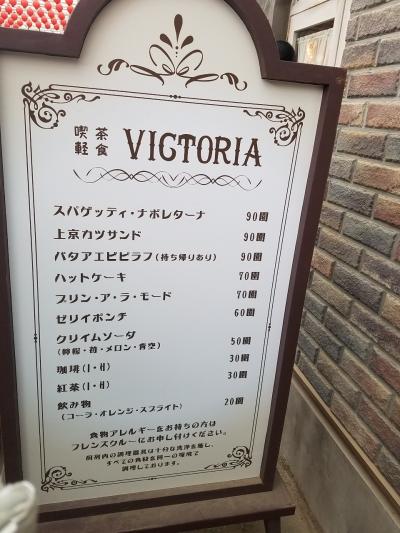 『喫茶ビクトリヤ』の食事・デザート・ドリンク類のメニューおよび価格は、”スパゲッティ・ナポレターナ”・”バタアエビピラフ”・”上京カツサンド”が90園(1080円)、”ハットケーキ”・”プリン・ア・ラ・モード”が70園(840円)、”ゼリイポンチ”が60園(720円)、”クリイムソーダ”が50園(600円)、”珈琲”・”紅茶”が30園(360円)、”ソフトドリンク”が20園(240円)となり、価格的には街中にある普通の喫茶店と比較すると割高に感じますが、レジャー施設内の飲食店施設であることを考慮すると妥当な価格設定であると思いました。