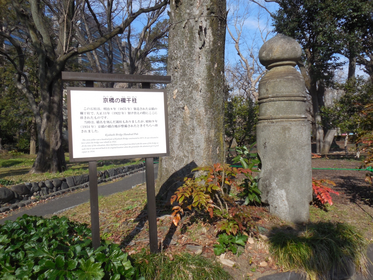 『日比谷公園 京橋の欄干柱』は、現在の東京高速道路の「西銀座ジャンクション」付近(江戸城を囲む外濠)から「京橋ジャンクション」(八丁堀・桜川に合流)付近まで、延長およそ600メートルの区間を西側から東側に流れる江戸時代に開削された運河として存在した「京橋川」を跨いで北側「日本橋」を起点とする「日本橋」エリアと南側「銀座」エリアを南北に結ぶ「中央通り(国道15号線)」の橋梁として1875年(明治8年)に架橋(現在の「銀座通り口」交差点付近)された石造アーチ橋(橋長およそ19.8メートル、橋幅およそ14.4メートルの)である『京橋』の「欄干柱」部分で、1922年(大正11年)に照明設備付きの新たな「親柱」が設置された際に歴史を伝える遺物として、明治期の『京橋』の銘板が刻まれた「親柱」とあわせて「日比谷公園」に移設されています。