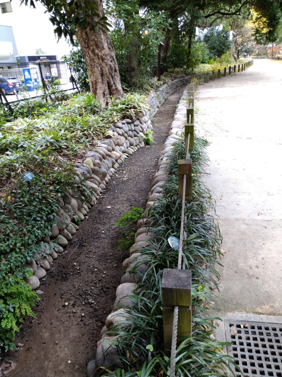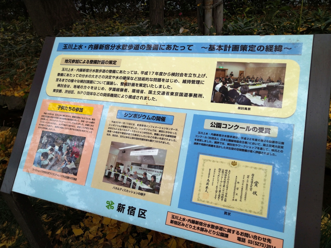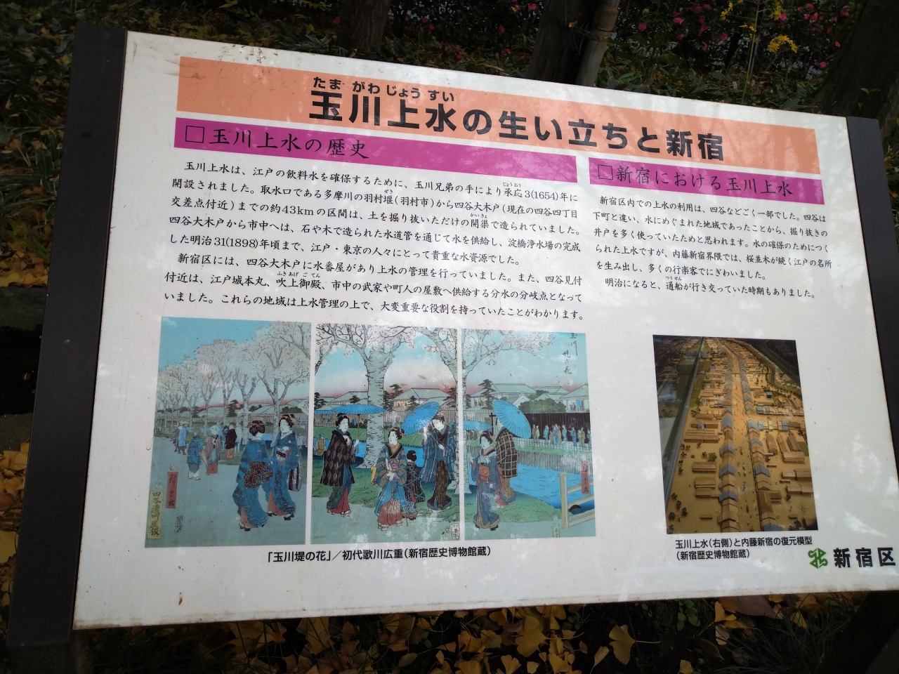 ちなみに現在の「新宿御苑」は、1691年(元禄4年)より幕末まで高遠藩(現在の長野県伊那市)の藩主を勤めた内藤家の「四谷荘」と呼ばれていた下屋敷跡であり、「新宿御苑」の『玉川上水 内藤新宿分水散歩道』に再現された「玉川上水」は、散策路の地下部分を通る「甲州街道(国道20号)・新宿御苑トンネル」内の共同溝に湧出していた地下水を水源として活用するための約100トンの水を貯留できる地下水槽を設けてポンプアップ方式により地上部分の水路に循環させて流し、水路周辺を武蔵野の雑木林等に生育する草木類を主体に四季の変化が楽しめる多様な植栽が配置されており、2010年(平成22年)に「第26回 都市公園コンクール」(材料・工法・施設部門:大規模施設)において「国土交通大臣賞」を受賞しています。