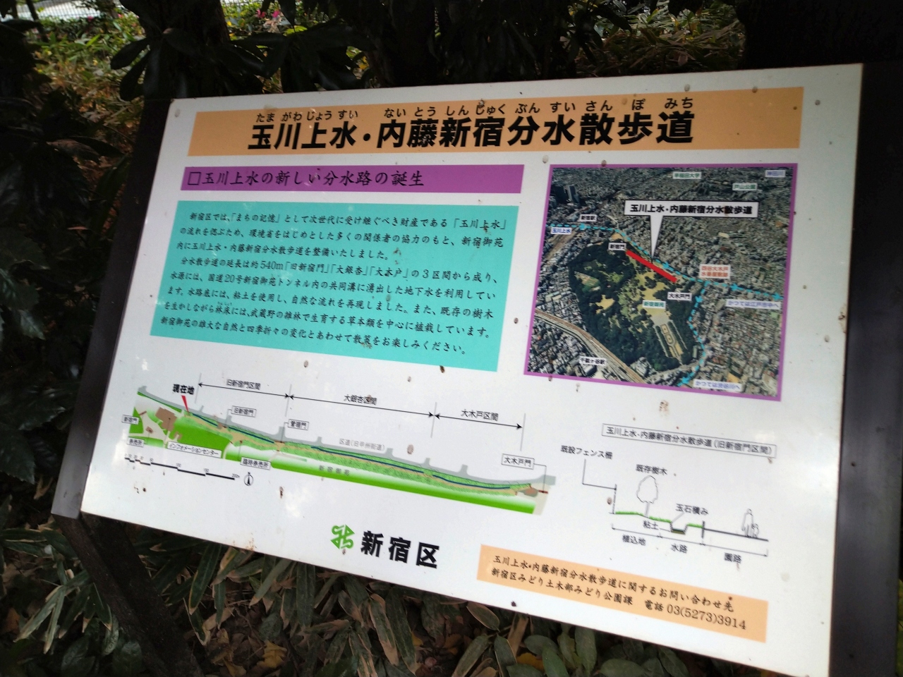 『玉川上水 内藤新宿分水散歩道』は、「新宿御苑」北側エリアの東側「大木戸門」から西側「旧新宿門」まで総延長およそ540メートルとなる区間を3工区に分割して、2009年度(平成21年度)に「大銀杏区間」(およそ240メートル)の整備を開始してから2010年度(平成22年度)に「大木戸区間」(およそ120メートル)さらに2011年度(平成23年度)に「旧新宿門区間」(およそ180メートル)までを3年間にわたり整備して、江戸時代にこの地を流れていた「玉川上水」の面影を次世代に継承することをコンセプトに再現した散策路です。