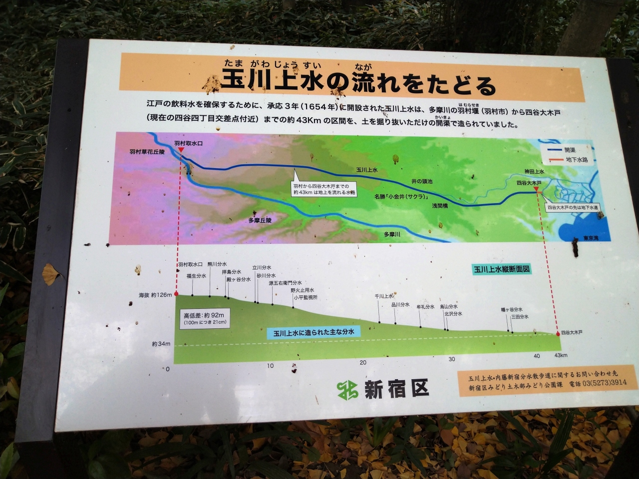 「玉川上水」は、江戸時代に大都市化する江戸府内の生活用水を確保するために多摩川上流の羽村(現在の羽村市)を「取水堰」として徳川幕府・第4代将軍「徳川家綱」の時代である1653年(承応2年)に開削された水路であり、「四谷大木戸」(現在の四谷4丁目交差点付近)までの全長およそ42.7キロメートル(高低差およそ92.3メートル)区間の地上部分を開渠とした水路で生活用水となる上水を流し、「四谷大木戸」以降の区間は地中部分に樋(木樋、石樋)を用いた暗渠として当時の江戸府内に上水が供給されています。