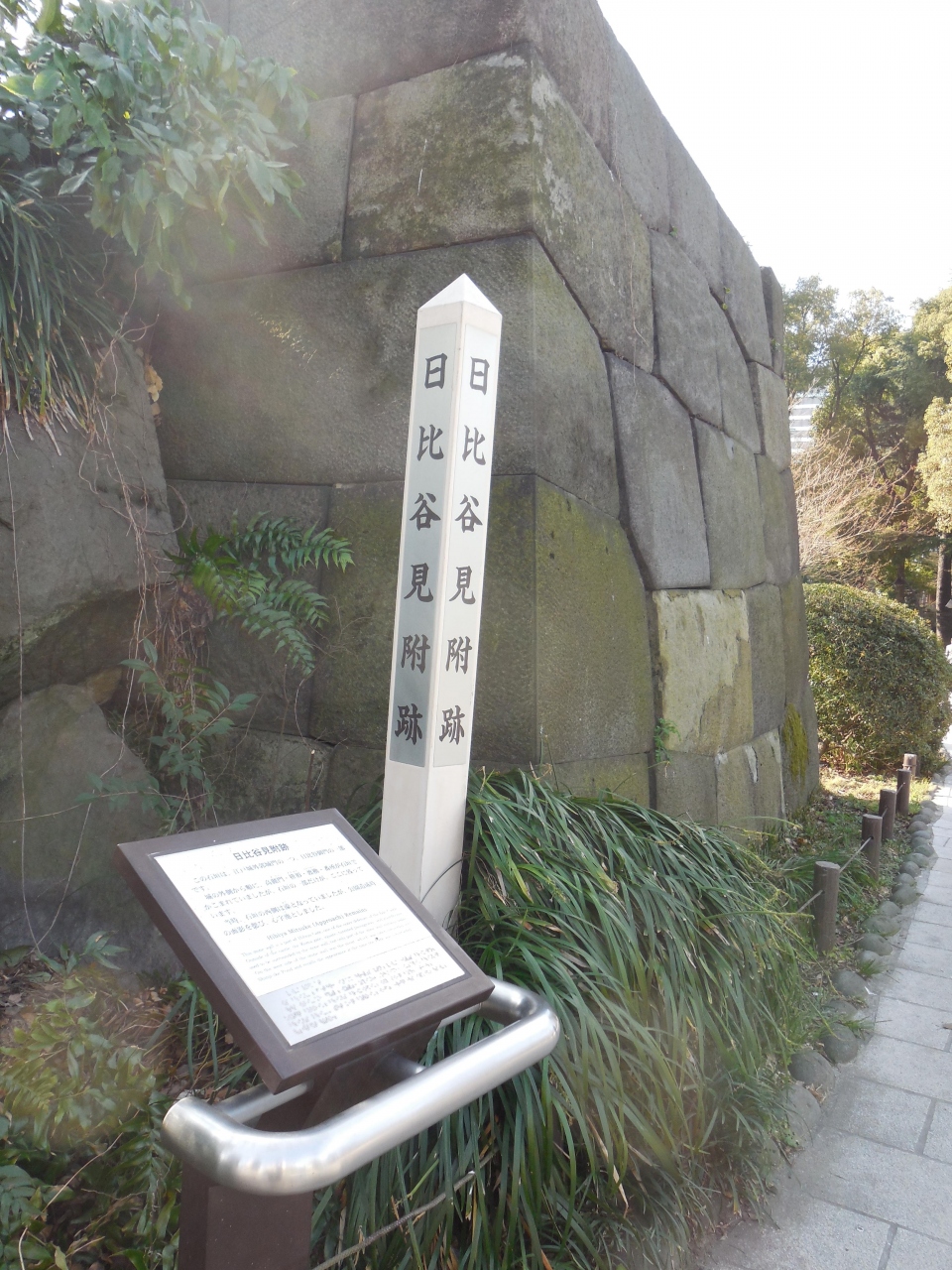 この「日比谷見附跡」から現在の公園東側「日比谷門」付近までの「日比谷通り」沿いに残る「石垣」は、江戸時代初期の1627年(寛永4年)に「江戸城」の濠に沿って自然石を加工せずにそのまま積み上げる「野面積み(のづらづみ)」工法を用いて築造されたもので江戸時代初期の歴史的に貴重な遺構であり、「江戸城」の濠であった部分は「日比谷公園」を造成する際に濠の面影を偲び一部分を『心字池』として和風池に形を変えて「日比谷公園」に残されています。
