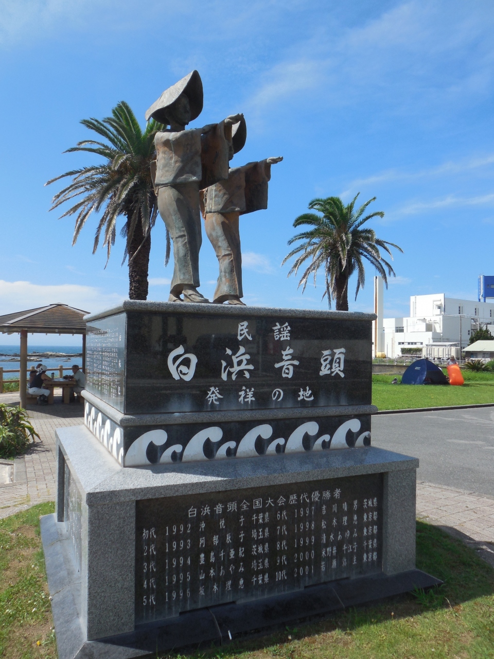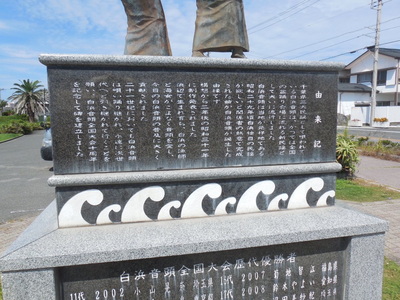 白浜町では、”「白浜音頭」で町おこし”を合言葉として1992年(平成4年)に第1回「白浜音頭全国大会」が開催され、2001年(平成13年)になると大会10周年記念事業として「白浜音頭発祥の地・記念像」が建立されましたが、その後の「白浜音頭全国大会」は、2009年(平成21年)の第18回大会をもって開催が終了しています。