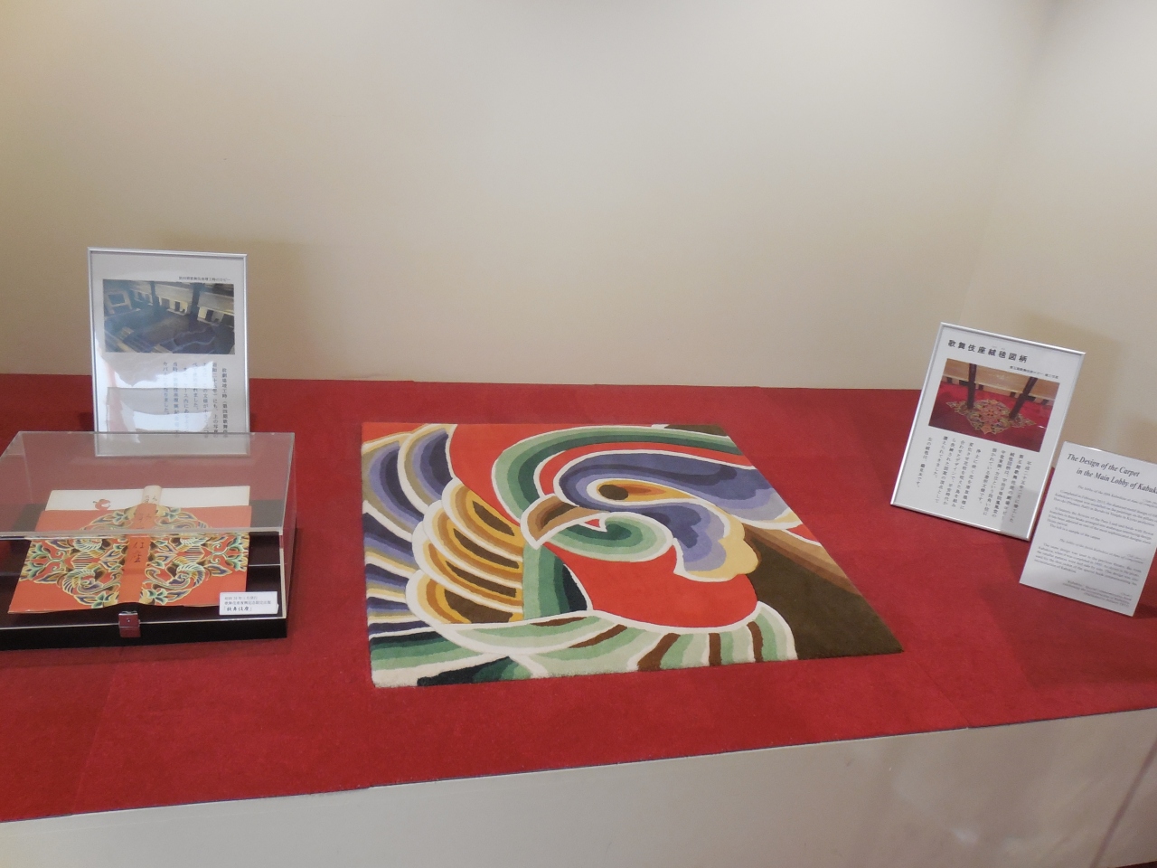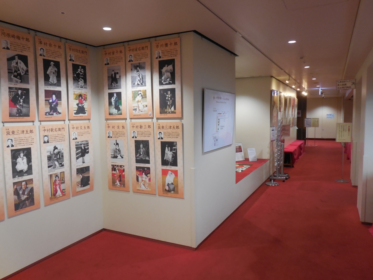 - 第1期から第4期 歌舞伎座・建物模型の展示と往年の歌舞伎俳優の写真パネルが掲示されています。