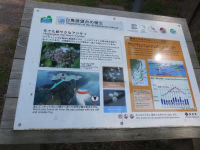 「白島展望台」から望む眺望は、天候にも恵まれ『白島海岸』に突き出た陸地部分となる「白島崎」の松などの緑と『白島海岸』周辺の島々(無人島)白い岩肌から日本海の碧く澄んだ海が水平線まで続く自然豊かな大パノラマの絶景を一望することができ満喫するとともに「白島展望台」駐車場から「白島展望台」までの遊歩道に群生しているアジサイの花も観賞することもできました。