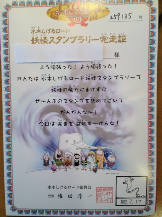 無事、全部スタンプを押すと観光協会で鬼太郎ファミリーの絵のある「証明書」や証明スタンプを押して貰えます。(18:00まで、2012年7月現在)