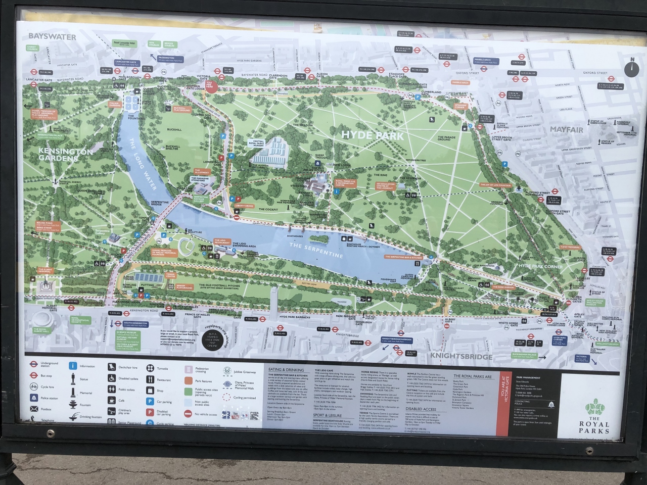 ハイドパーク横にある大きな公園です。ジョギングしている人や犬の散歩をしている人が多かったです。街中の観光に疲れた人は、このような緑豊かな公園で休息の時間を過ごすのもいいかもしれません。綺麗な池や噴水もあります。