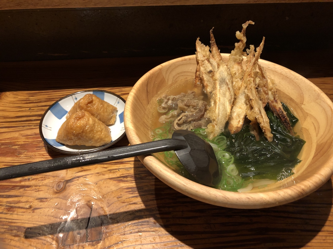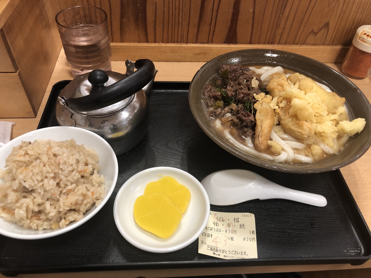 博多バスターミナルの地下にある店舗です。汁を吸ったベチャベチャなうどんがたまらなく美味しいです。讃岐うどんが好きな人にはおススメしません。ごぼてんや、かしわ飯もあるので結構お腹いっぱいになります。出汁はカツオが効いているのかなーと思います。