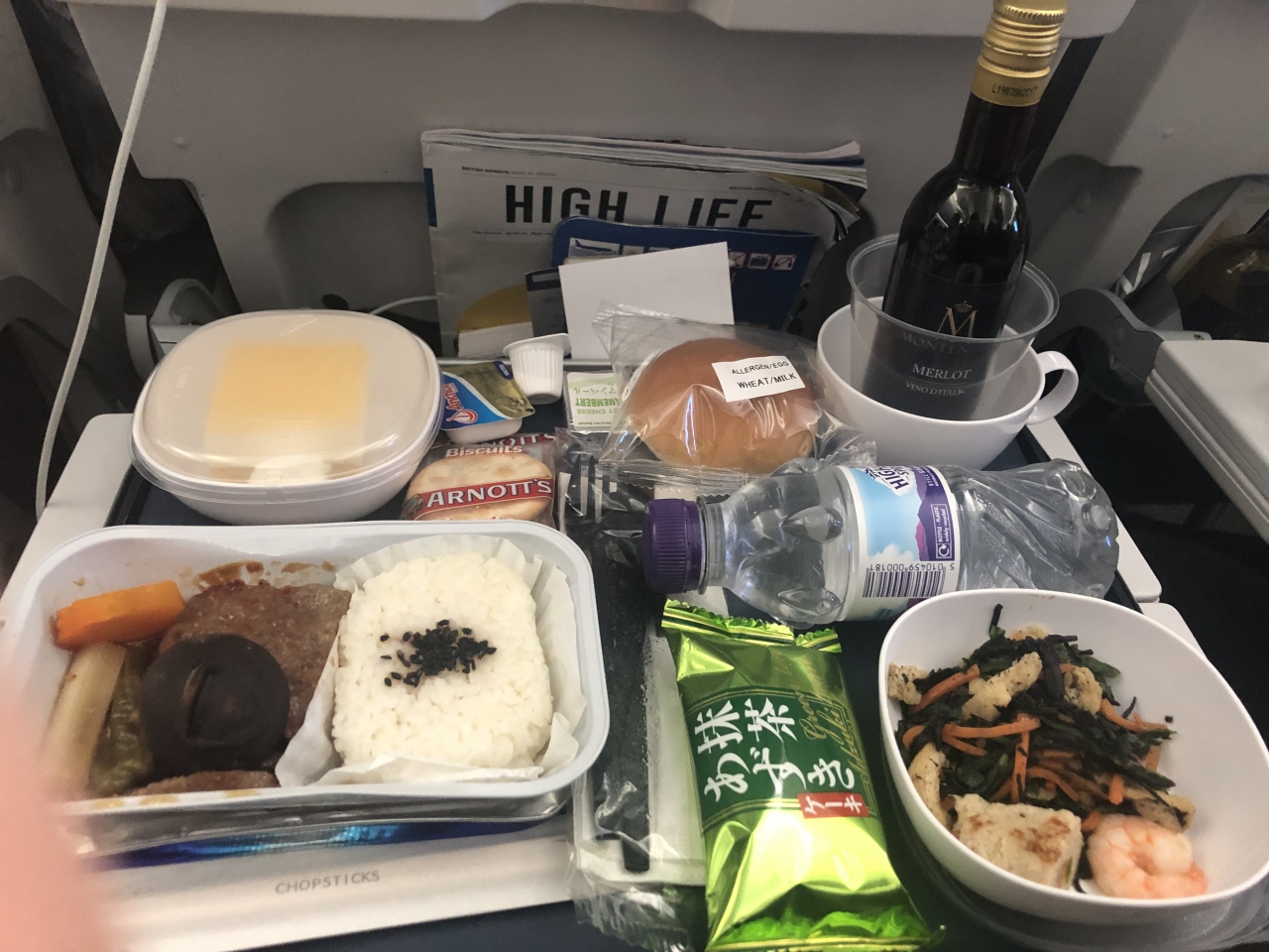 離陸後、スナックとドリンクのサービスがあり、ビールとワインを両方いただけたことは良かったです。その後の食事でもアルコール飲料をいただけました。完全に酔っ払いでした(笑)料理は可もなく不可もなくの洋食/和食料理で、到着前には軽食サービスもあります。