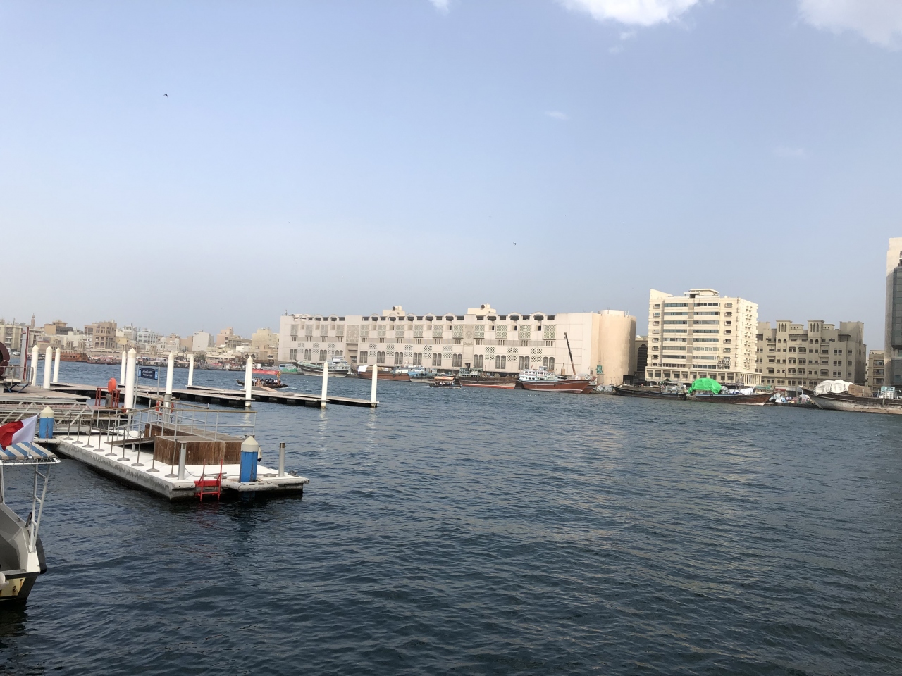 ドバイの歴史地区沿いを流れる川。川の反対岸へは渡し船で移動できるようです。川沿いは、オールドスークや、アルファヒディ歴史地区があるため、観光に疲れた時にゆっくりと川の流れや景色を眺めてリラックスすることができます。