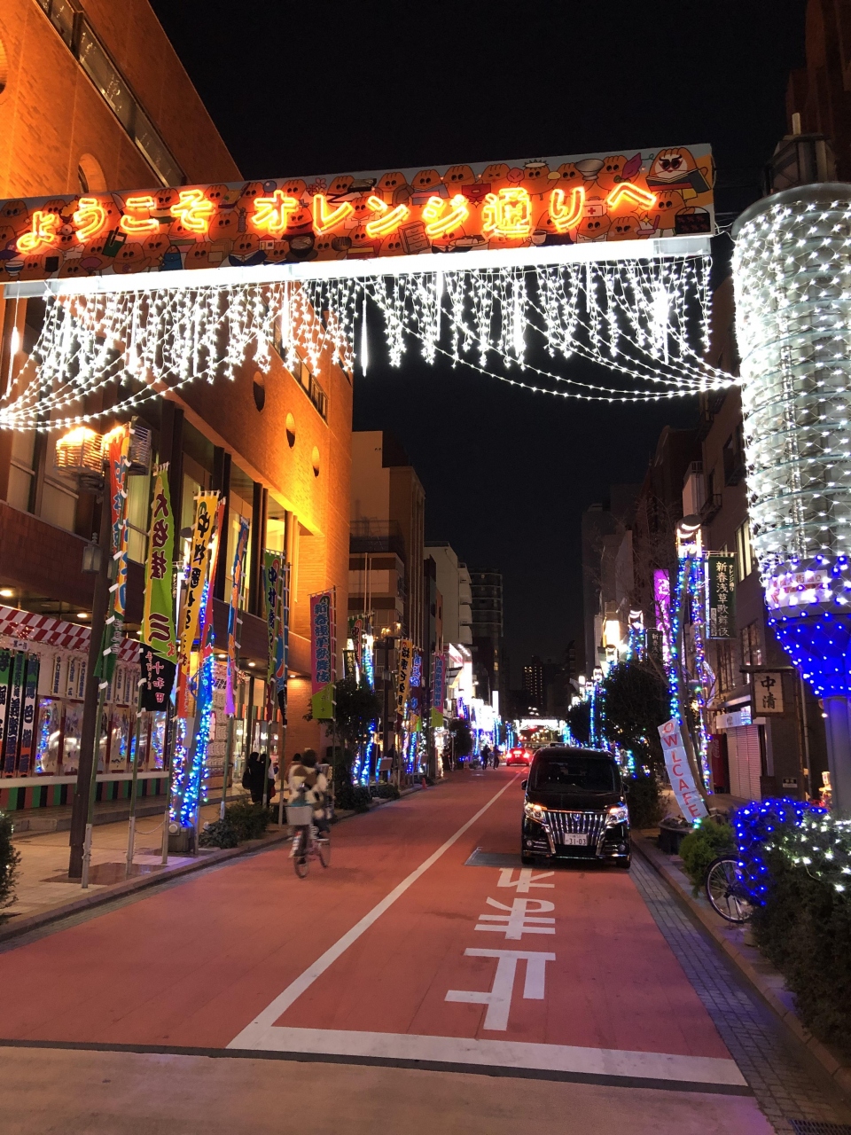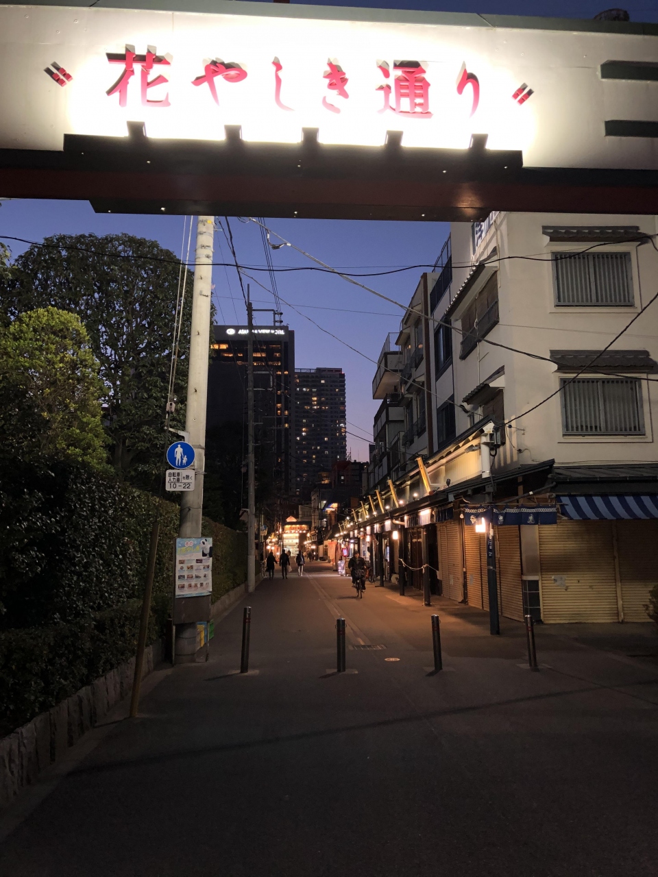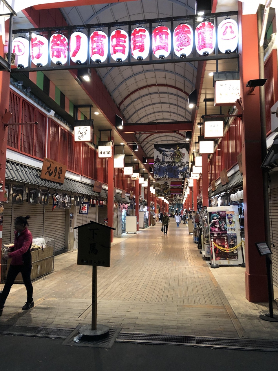 商店街の町並みは、江戸の下町のような雰囲気があります。綺麗に整備された商店街で、居酒屋、食堂、大衆劇場など色々な種類のお店が並んでいる通りです。歌舞伎をテーマにしたお店も多く、外国人観光客も多く訪れていました。