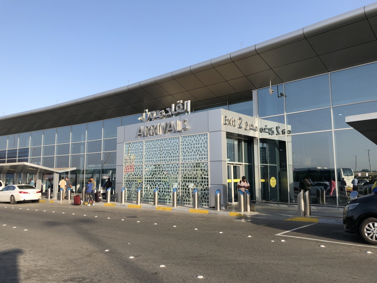 市内からは、路線バスで1時間程かかる位置にあります。ドバイの空港と比べると小さくて、コンパクトな空港だと思いますが、綺麗な空港でWi-Fiも使えて便利でした。空港到着出口を出て正面にバス停があり、市内までのバスが発着しています。