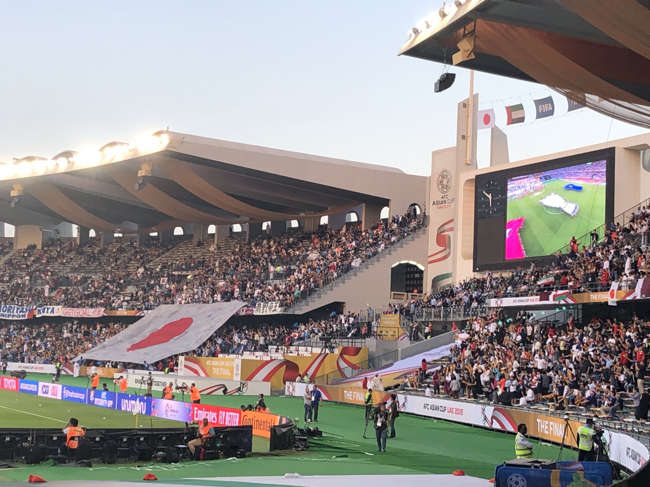 サッカーアジアカップ2019決勝戦を見に行きました。アブダビ市内中心と空港の大体中間くらいにあると思います。周辺一帯が公園のようになっていて、敷地面積が巨大でした。バスも停まり、複数の路線のバスが利用できます。