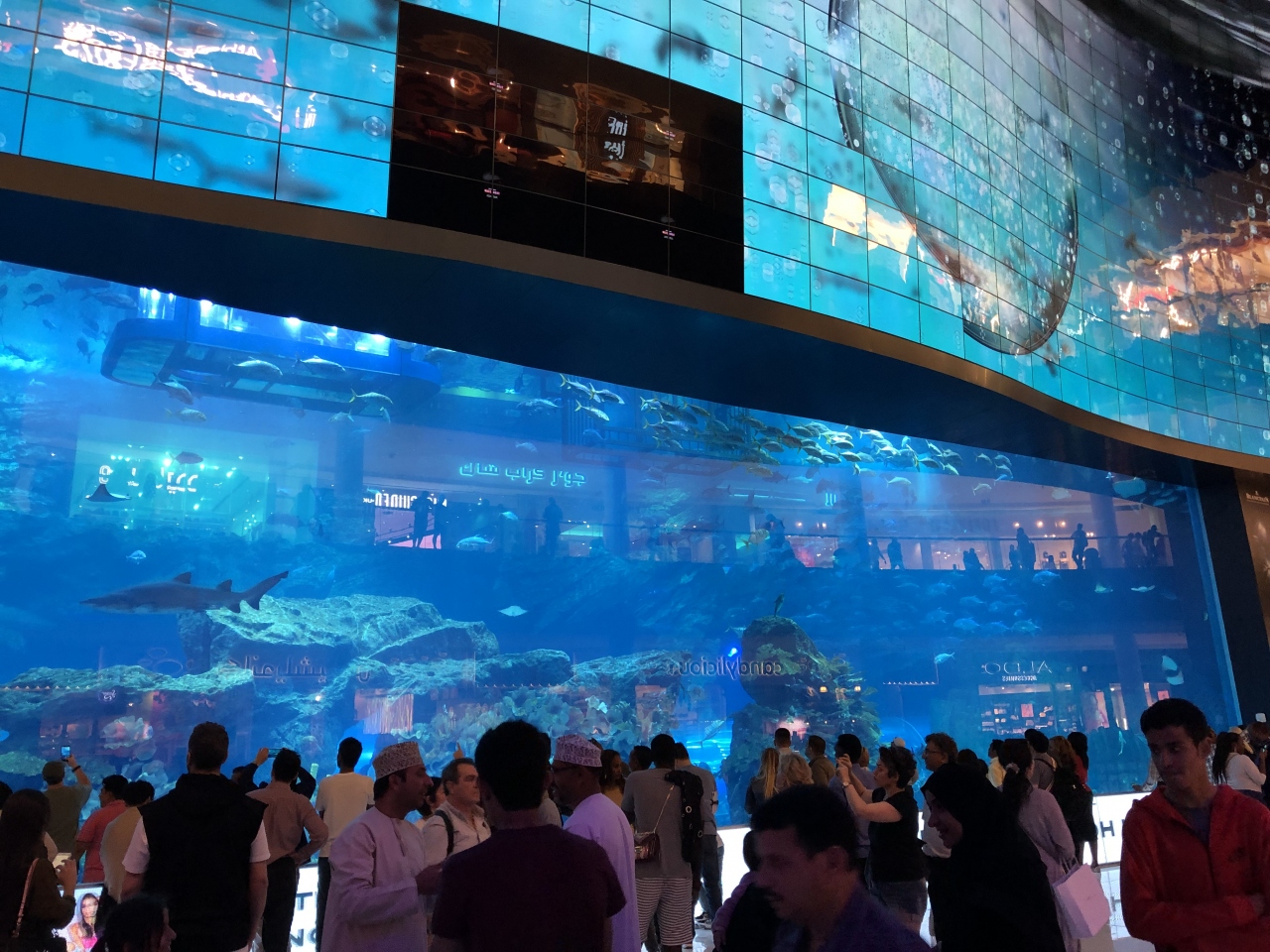 超巨大ショッピングモールのドバイモールには水族館もあります。入場せずとも。外からも水槽が見えるため、ショッピングの合間に魚を眺めることができました。入口は1Fにあり、2Fや3Fからも水槽がみえます。熱帯魚などの珍しい魚ではないようでした。